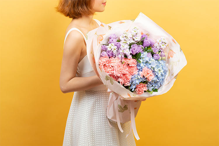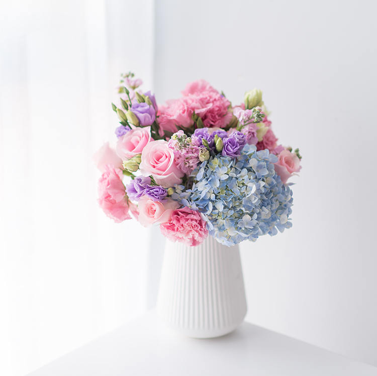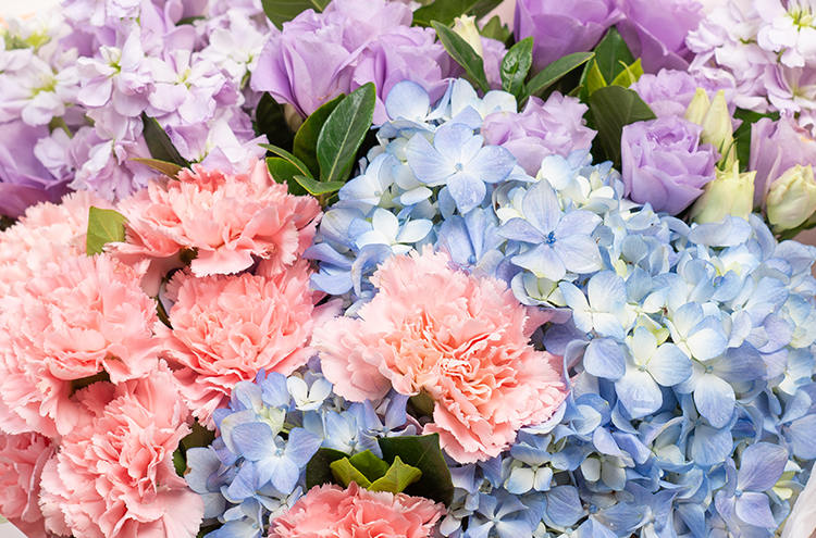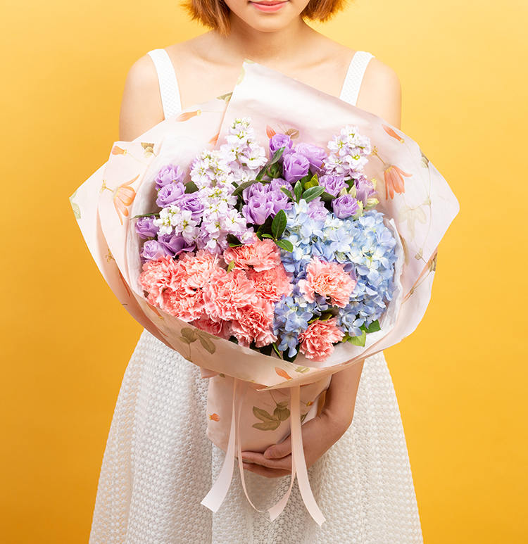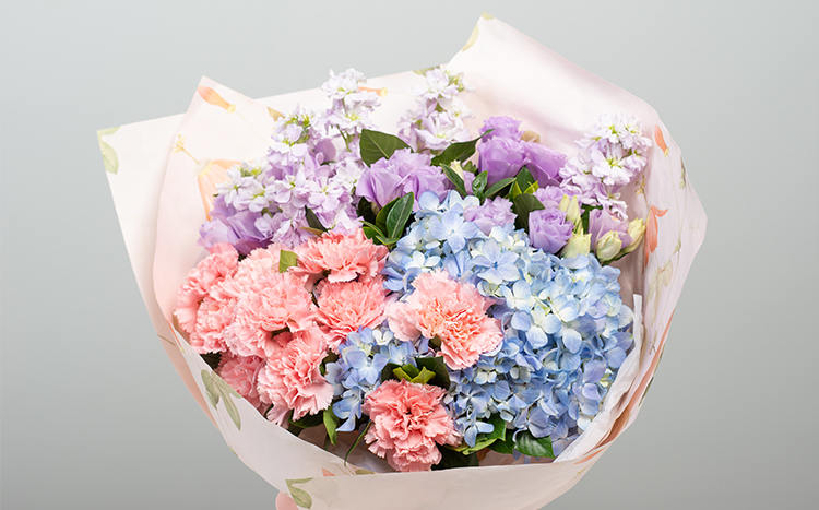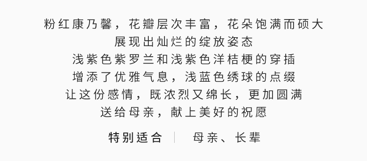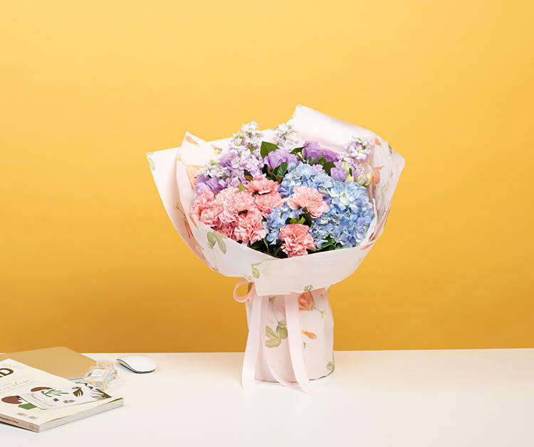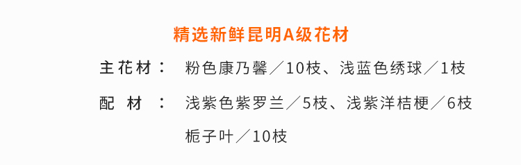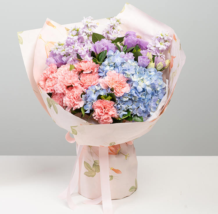 粉色康乃馨10枝,浅蓝色绣球1枝,浅紫色紫罗兰5枝(紫罗兰花期为12-4月,其他月份用粉色/浅紫金鱼草等相似线条状花材替代),浅紫洋桔梗6枝,栀子叶10枝