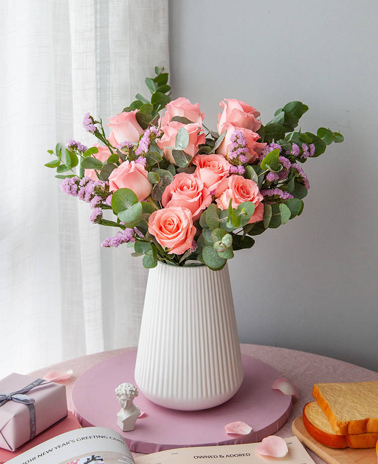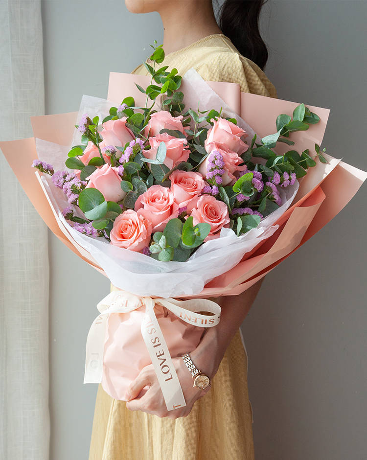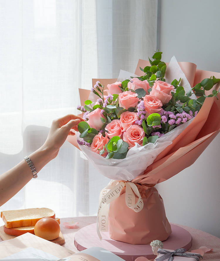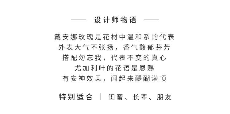 戴安娜粉玫瑰11枝、浅紫勿忘我3枝(勿忘我缺货则用粉色/紫色满天星代替)、尤加利10枝