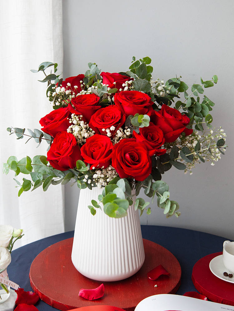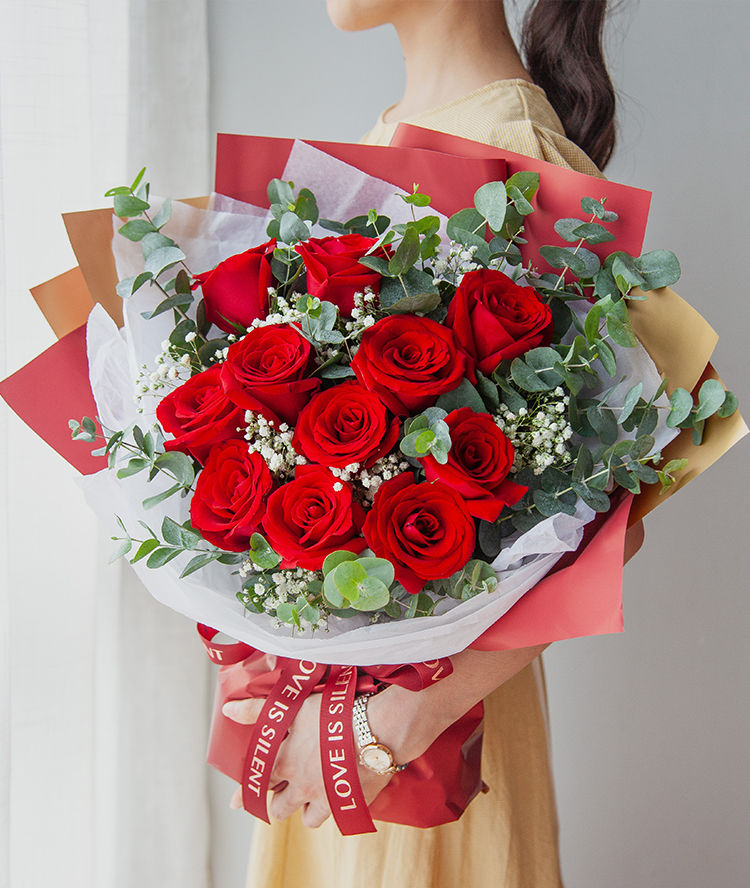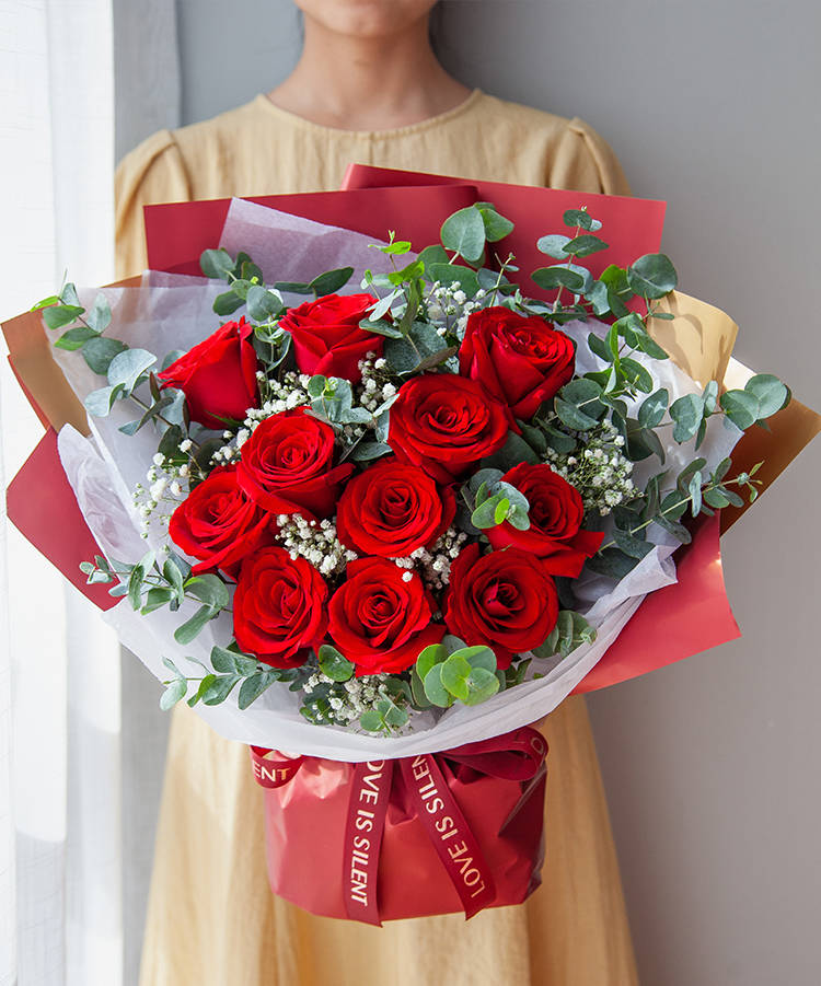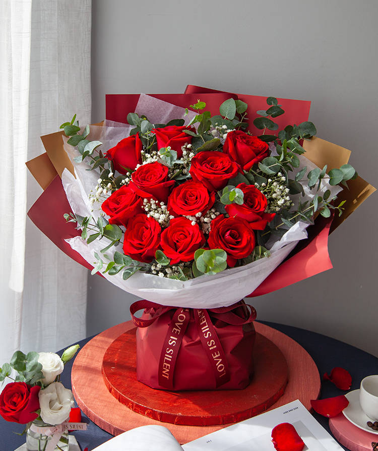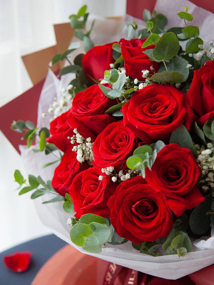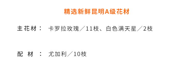 卡罗拉红玫瑰11枝、白色满天星3枝、尤加利10枝