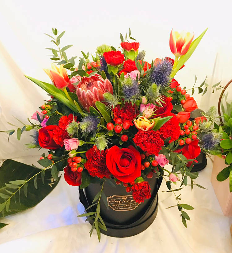 立减8元卡罗拉玫瑰12枝,红郁金香3枝,桃红多头玫5枝,大红色多头玫5枝,公主1枝,红豆3枝,红康乃馨10枝,细叶尤加利3枝 刺芹6支
