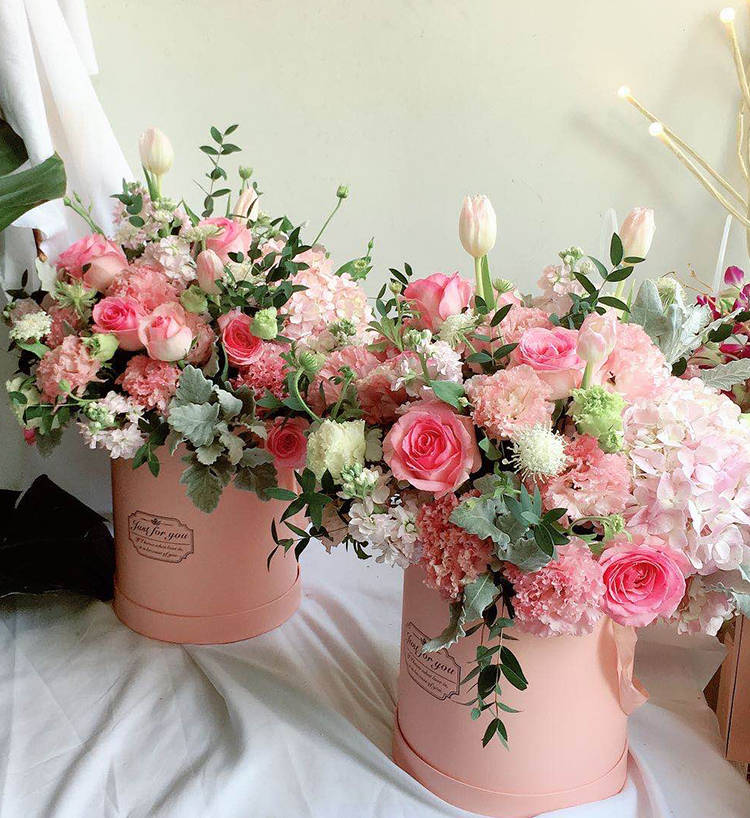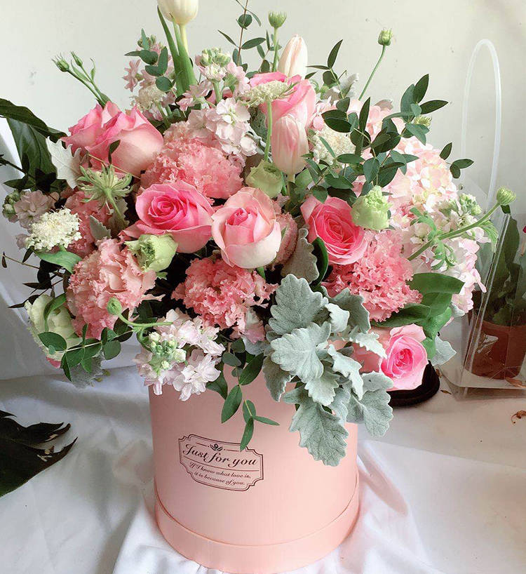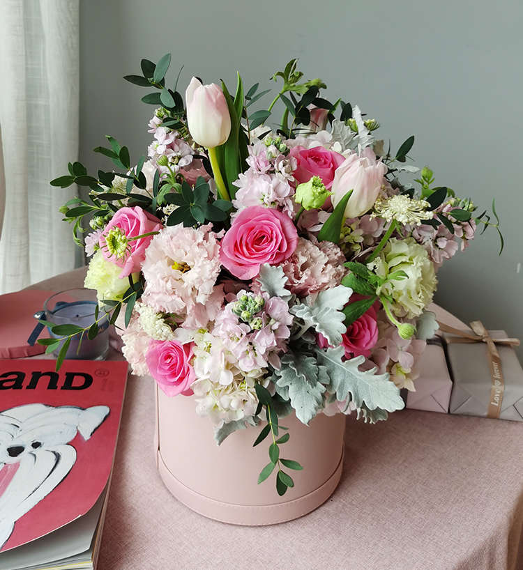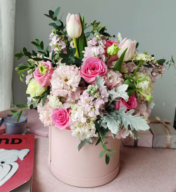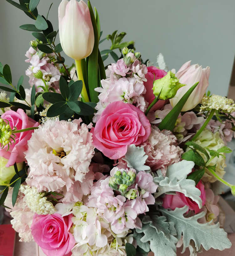 立减8元粉色款:粉紫罗兰5枝,粉郁金香3枝,波浪粉桔梗3枝,苏醒玫瑰12枝,粉绣球1枝,银叶菊5枝,细叶尤加利3枝,翠珠5枝