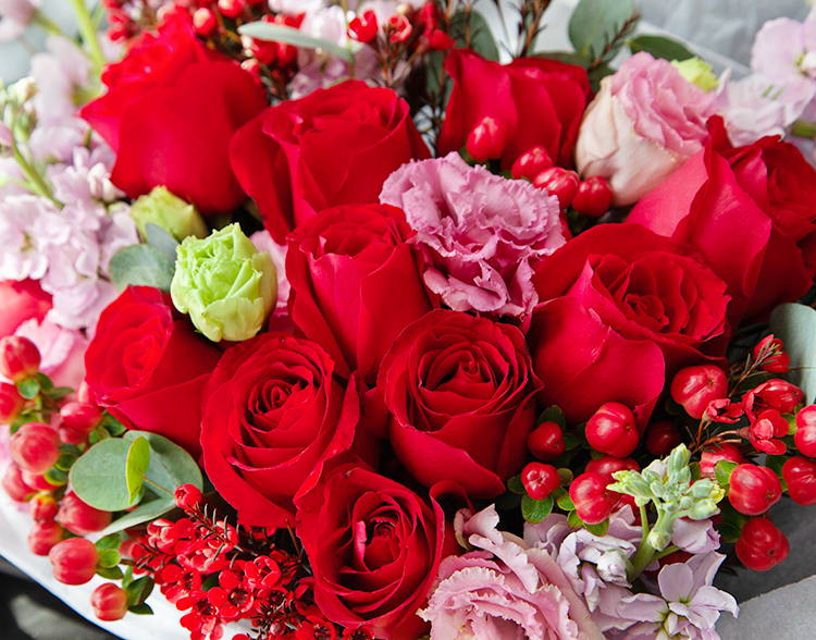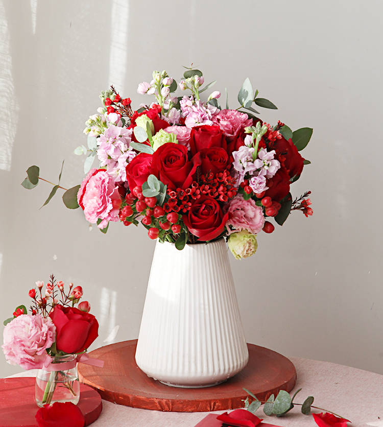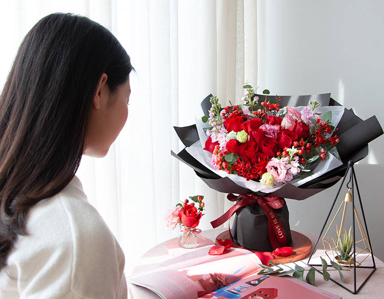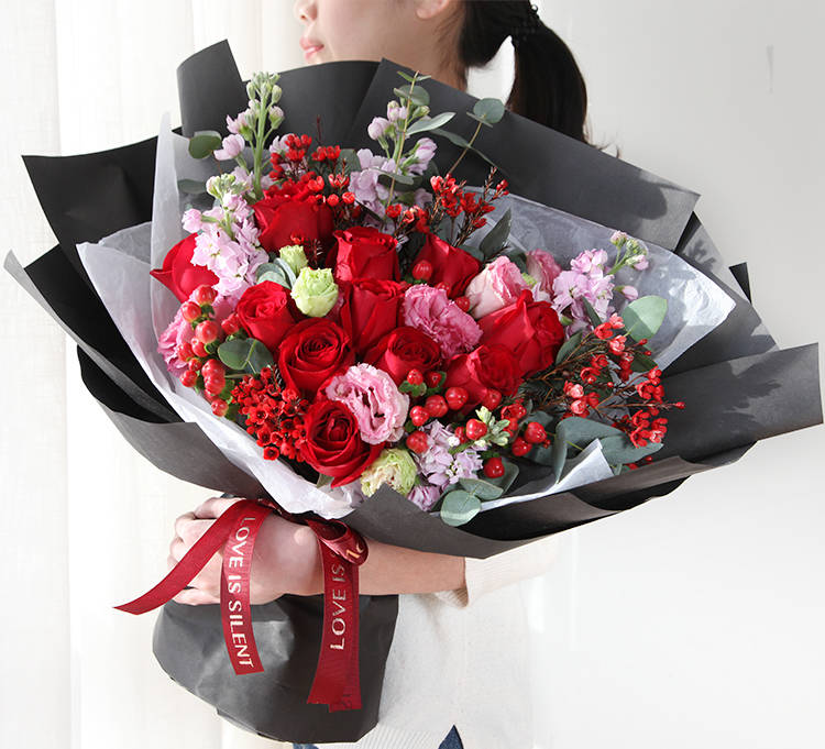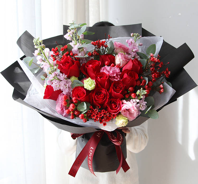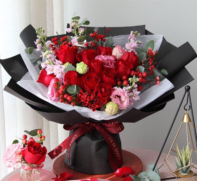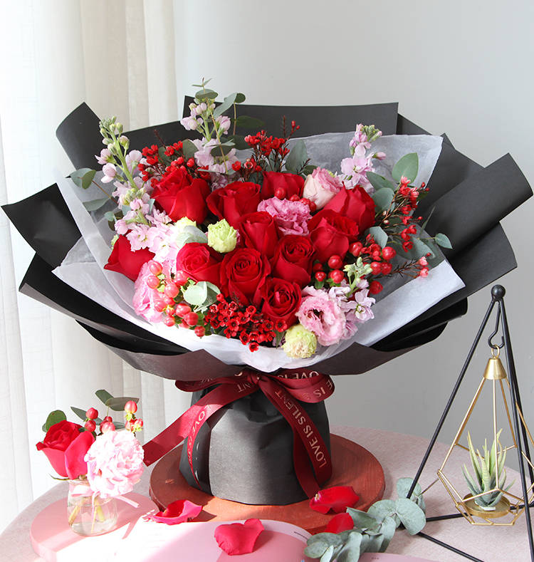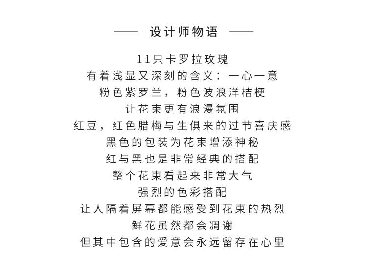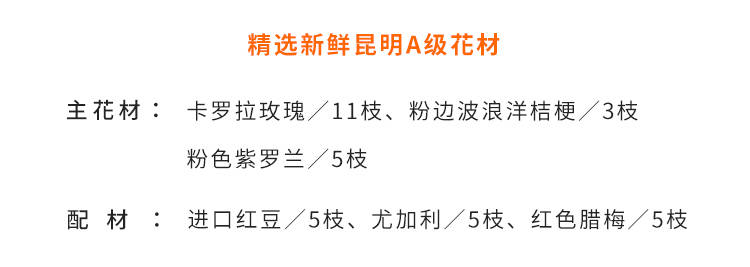 韩式高端鲜花系列:卡罗拉玫瑰11枝、粉边波浪洋桔梗3枝、粉色紫罗兰5枝、进口红豆5枝、尤加利5枝、红色腊梅5枝