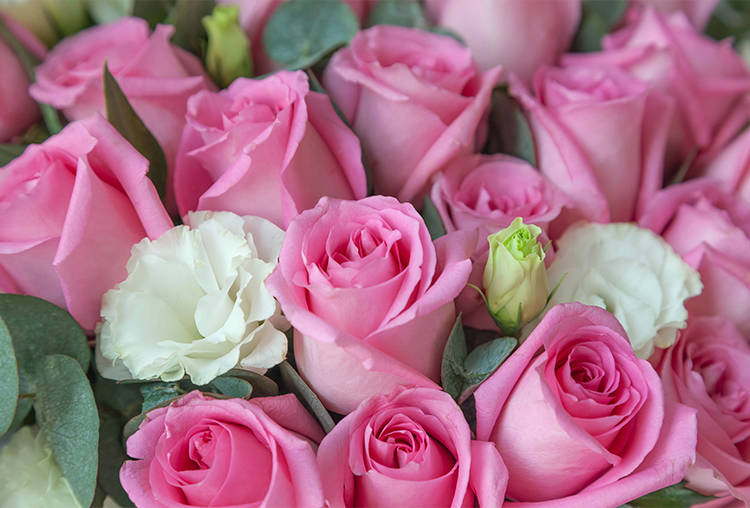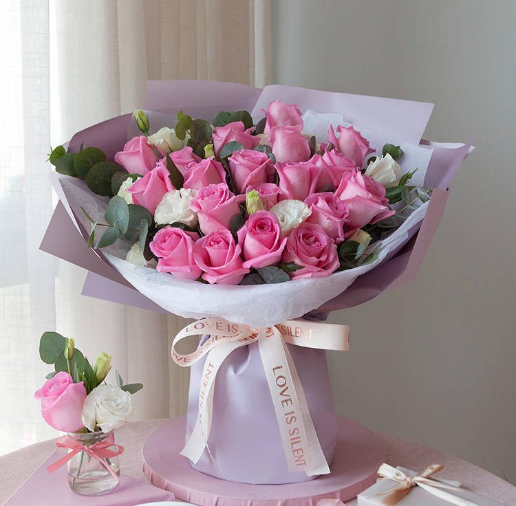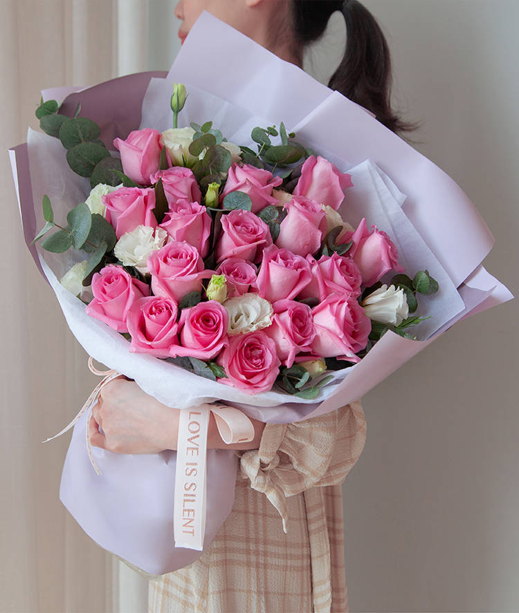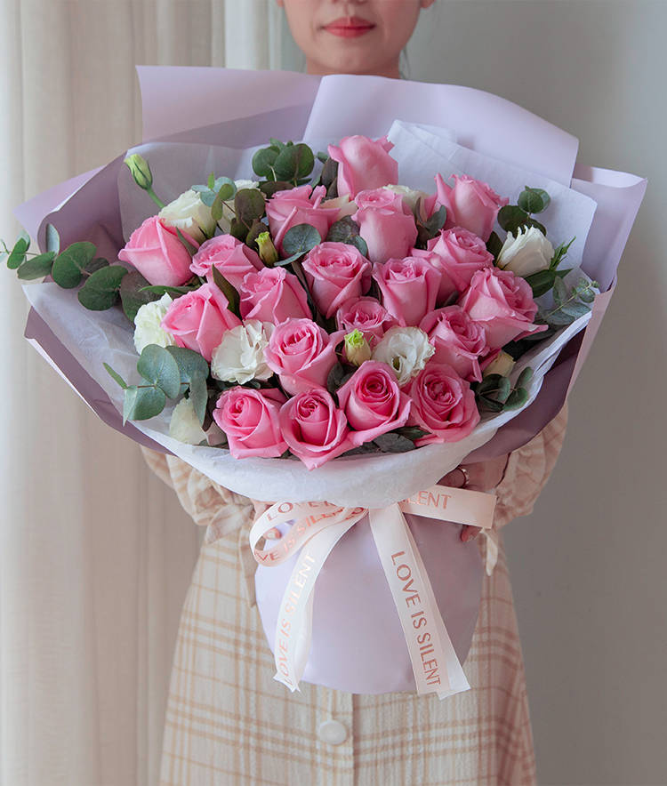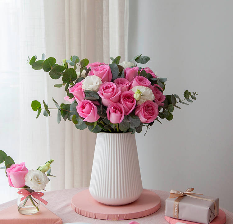 [韩式鲜花系列] 苏醒玫瑰19枝、白色洋桔梗3枝、尤加利10枝
