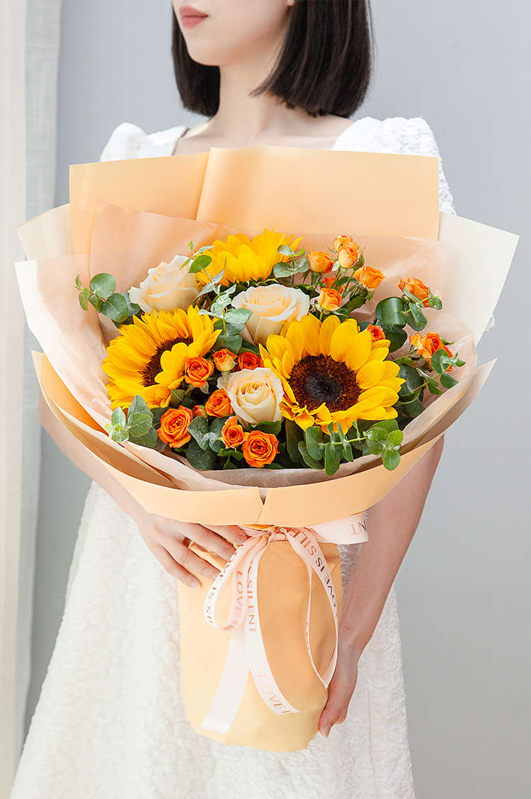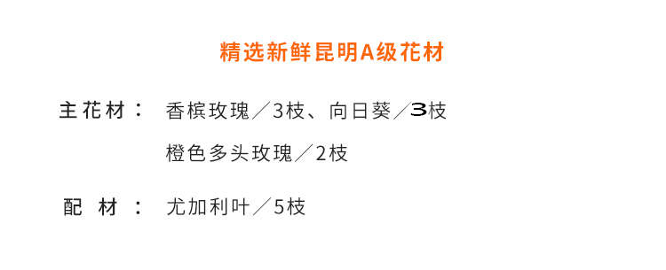 香槟玫瑰3枝、向日葵3枝、橙色多头玫瑰2枝(6-8头/支)、尤加利叶5枝