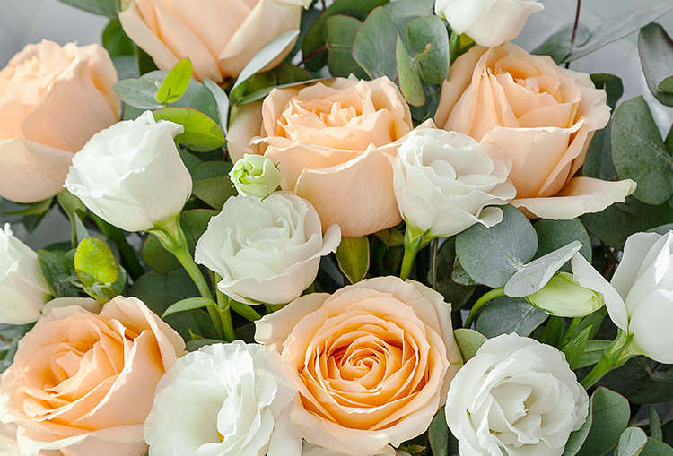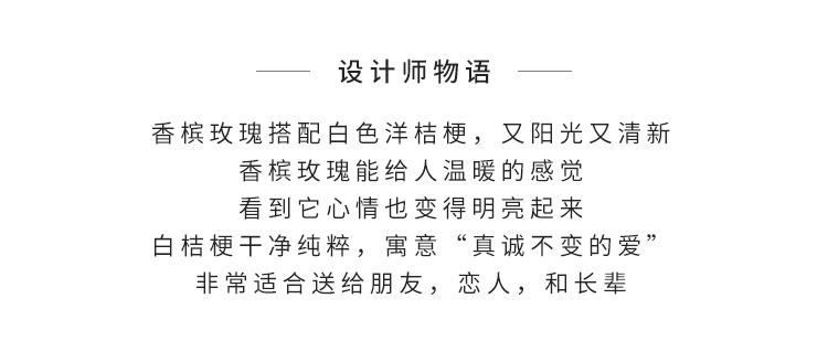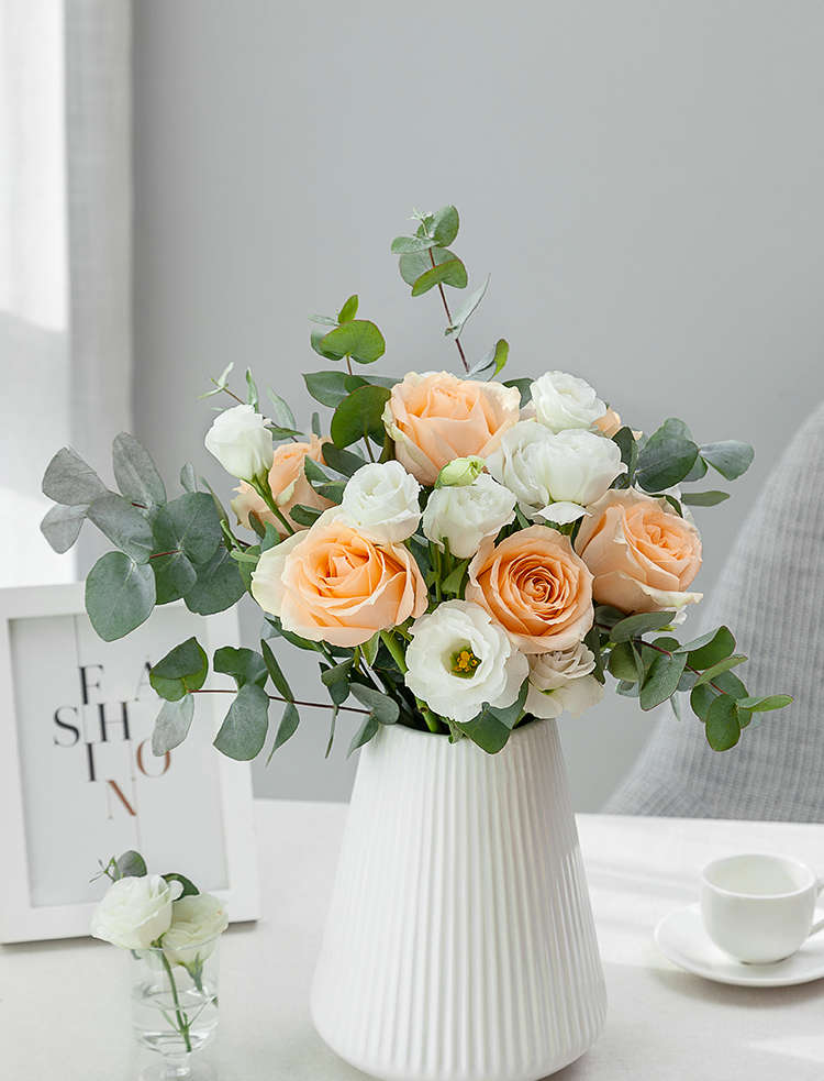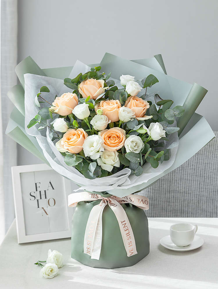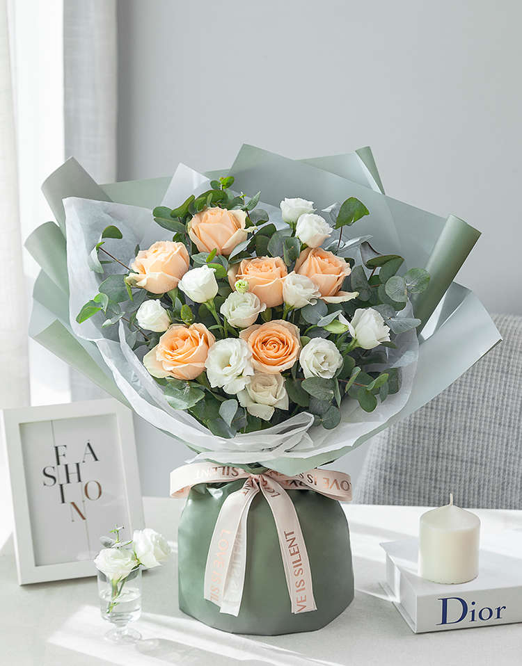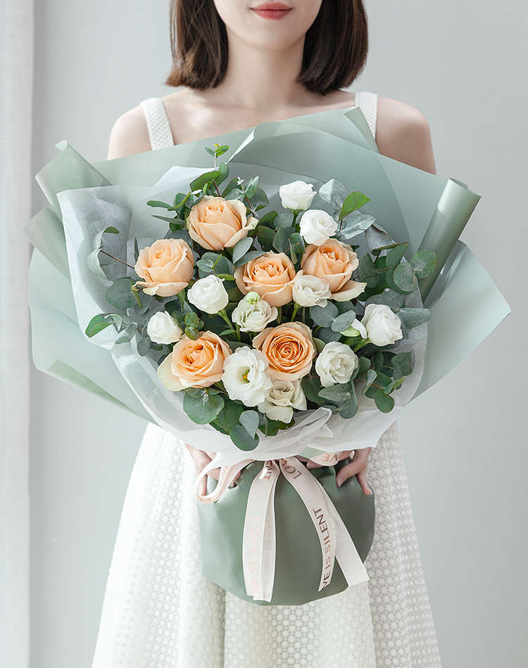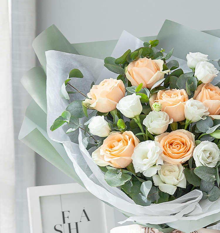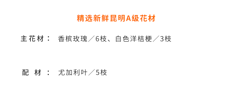 香槟玫瑰6枝、白色洋桔梗3枝、尤加利叶5枝