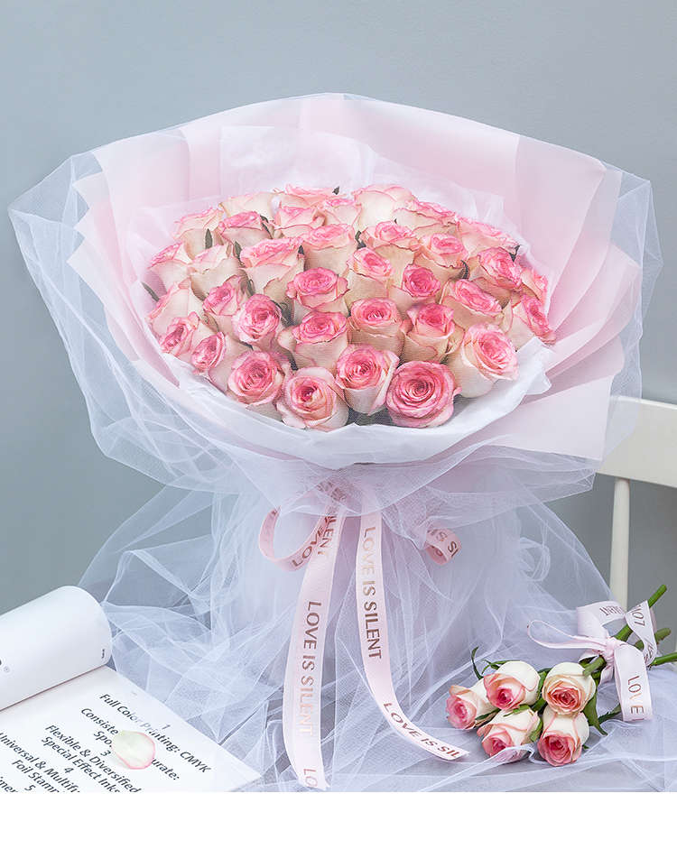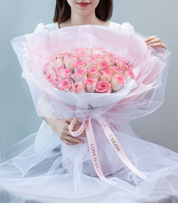 粉色雾面纸7张、白色雪梨纸2张、仙女纱2米(罩在花束上),粉色罗纹烫金丝带2米
