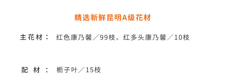 红色康乃馨99枝、红多头康乃馨10枝、栀子叶15枝
