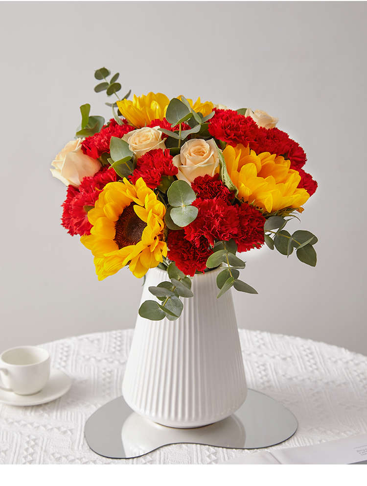 红色康乃馨33枝、香槟玫瑰9枝、向日葵3枝、尤加利叶5枝