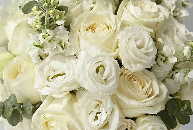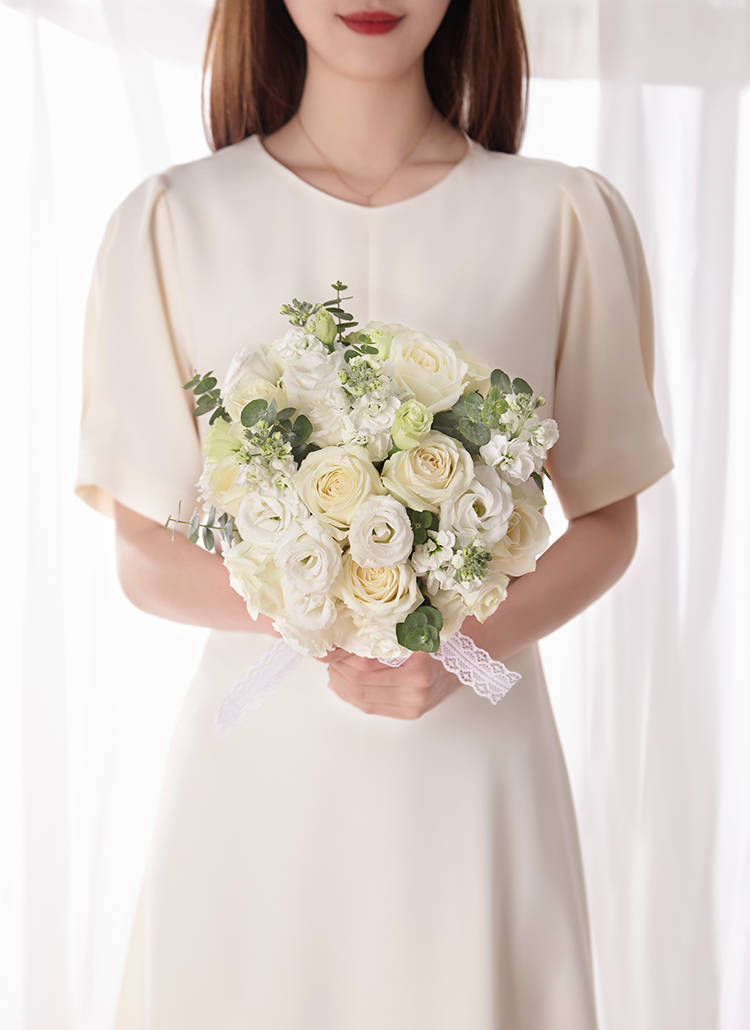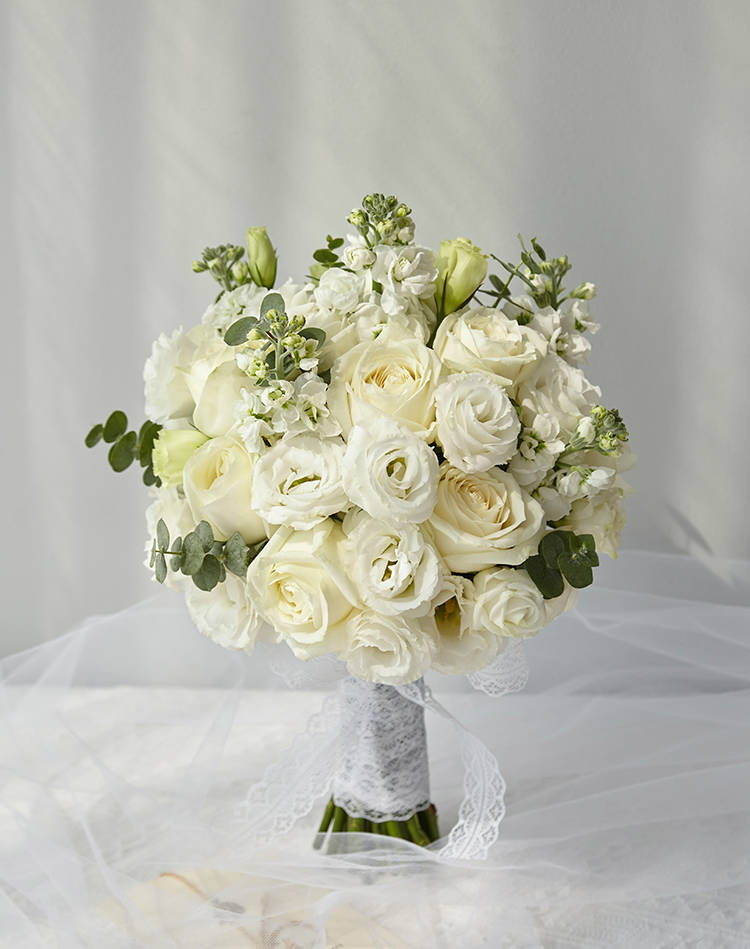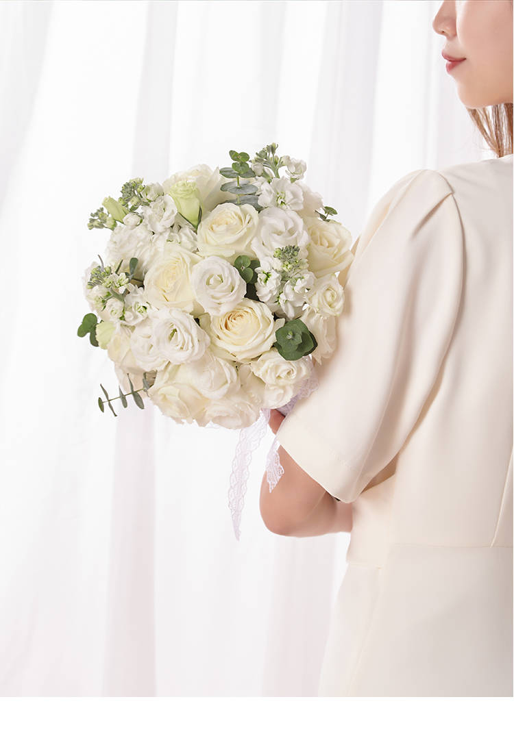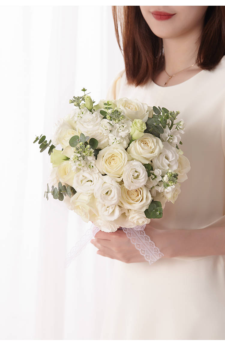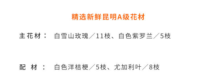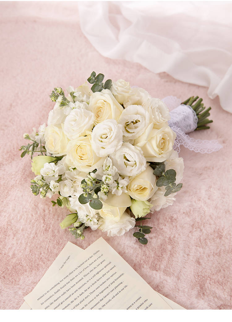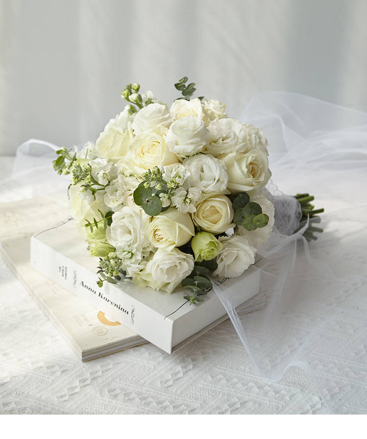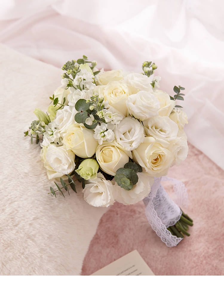 白雪山玫瑰11枝、白色紫罗兰5枝、白色洋桔梗5枝、尤加利叶8枝