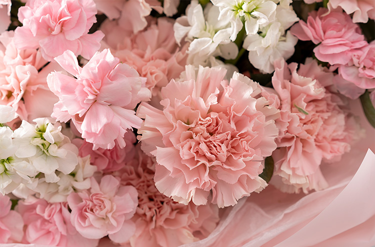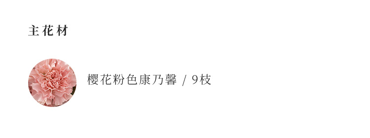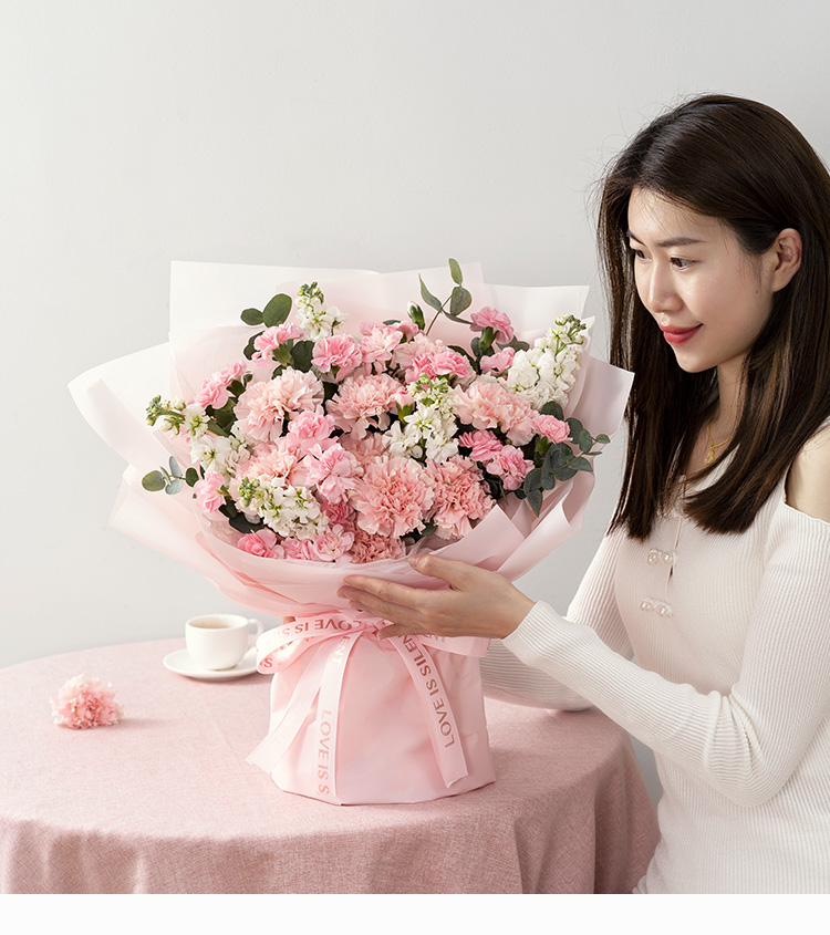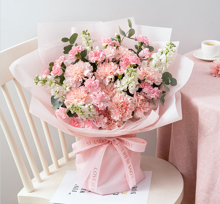 樱花粉色康乃馨9枝,粉色多头康乃馨5枝(4-6头/支)、白色紫罗兰5枝、尤加利5枝