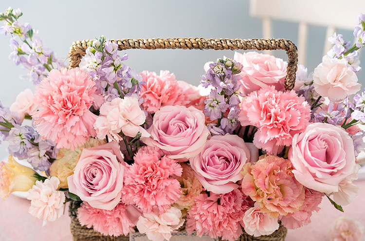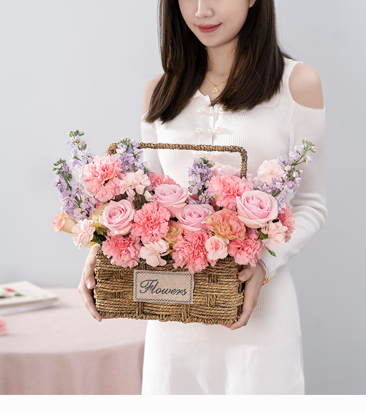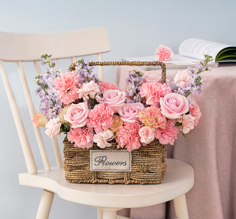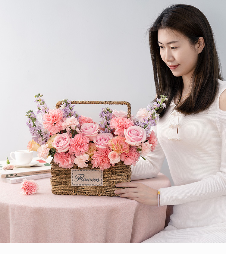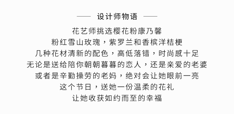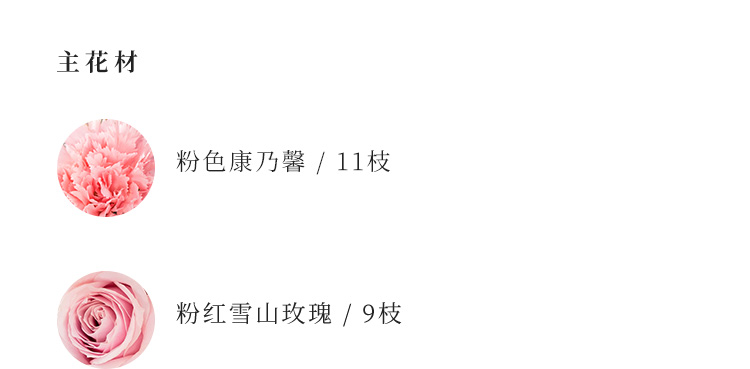 粉色康乃馨11枝,粉色多头康乃馨3枝、粉红雪山/戴安娜粉玫瑰9枝、紫色紫罗兰6枝、香槟色洋桔梗4枝(3头以上/支)
