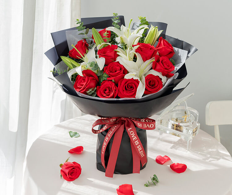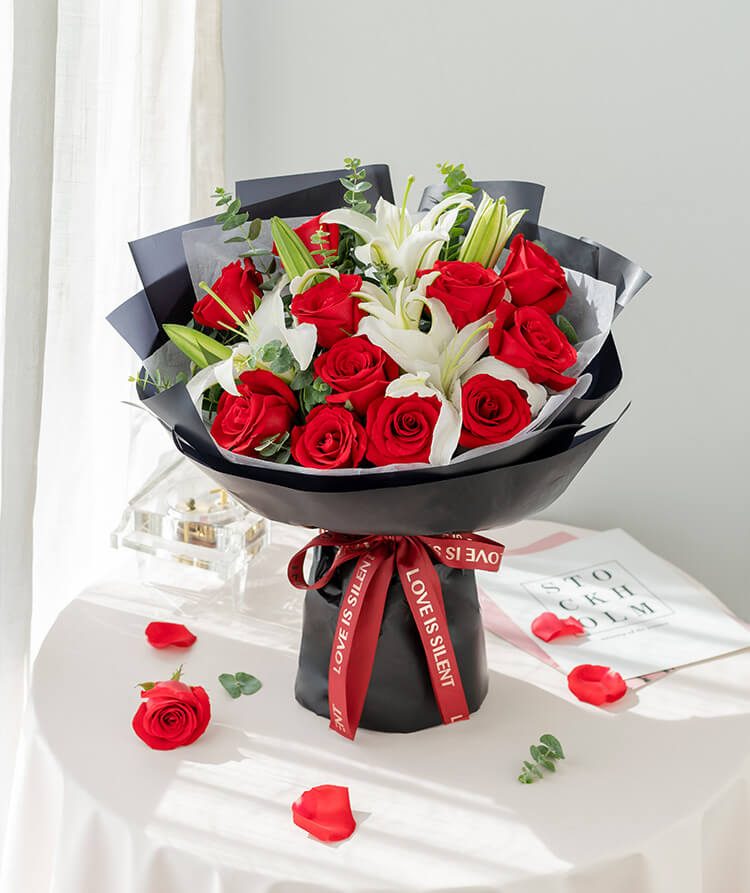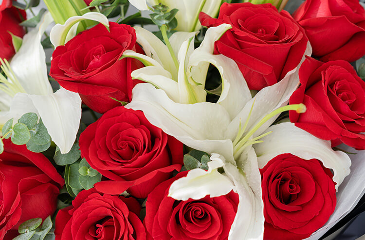 [百合花开,幸福自来] 卡罗拉红玫瑰11枝、白色香水百合2枝、尤加利叶10枝