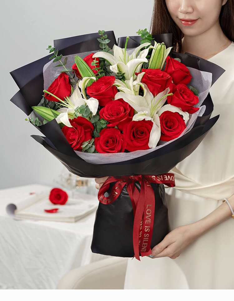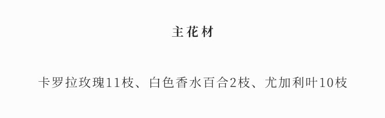 卡罗拉红玫瑰11枝、白色香水百合2枝(3-5头/支)、尤加利叶10枝