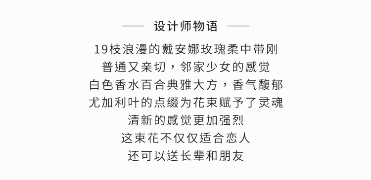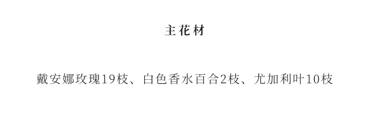 戴安娜玫瑰19枝、白色香水百合2枝(3-5头/支)、尤加利叶10枝