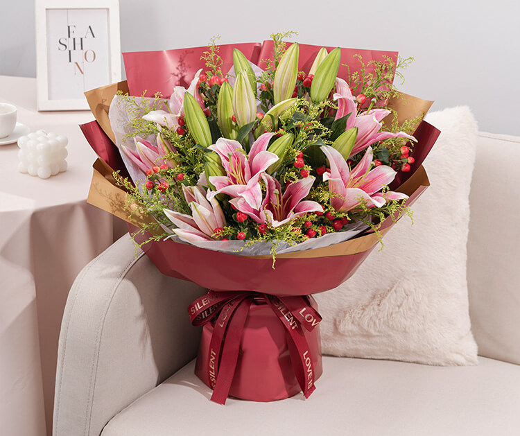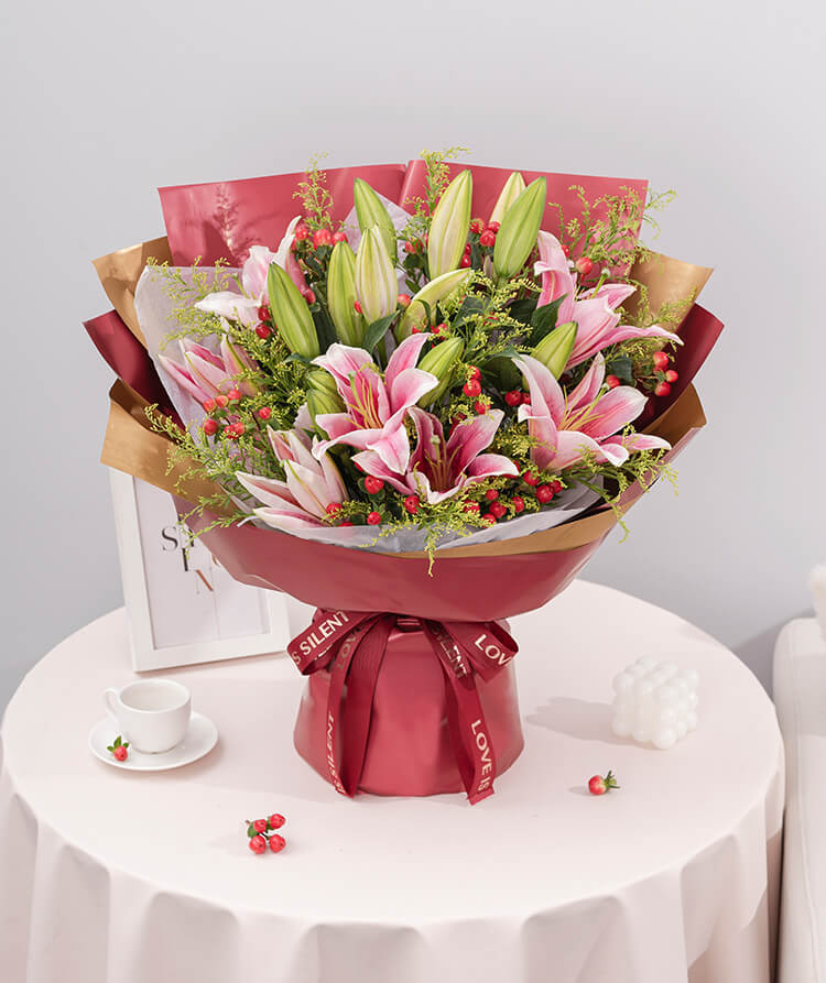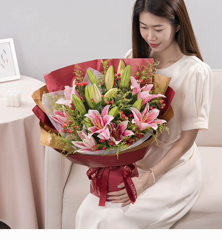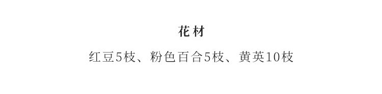 红豆5枝(3头以上)、粉色百合5枝(3-5头/支)、黄英10枝