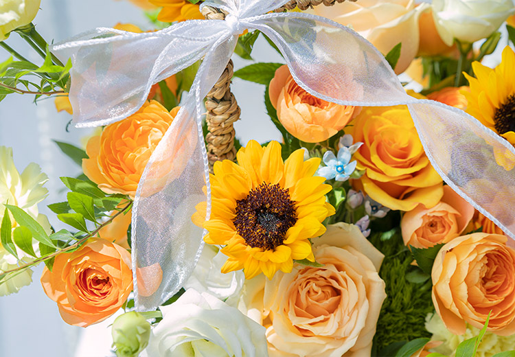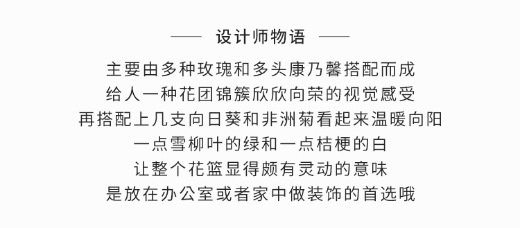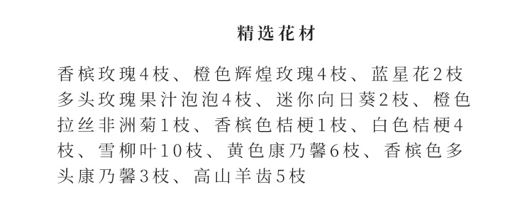香槟玫瑰4枝、橙色辉煌玫瑰4枝。蓝星花2枝,多头玫瑰果汁泡泡4枝。迷你向日葵2枝,橙色拉丝非洲菊/橙色非洲菊1枝。香槟色桔梗1枝,白色桔梗4枝、雪柳叶10枝。黄色康乃馨6枝。香槟色多头康乃馨3枝。高山羊齿5枝。