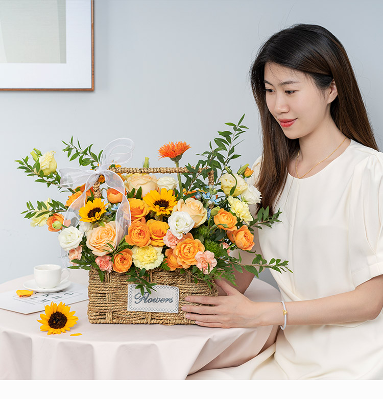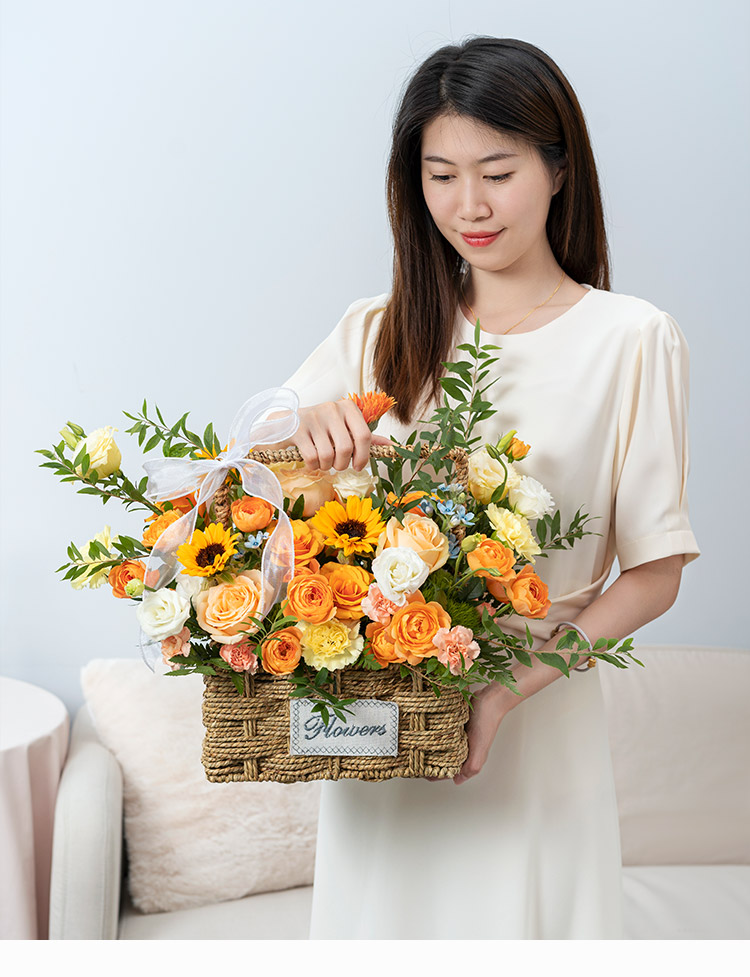 [秋日暖阳系列] 香槟玫瑰4枝、橙色辉煌玫瑰4枝、多头玫瑰果汁泡泡4枝、迷你向日葵2枝,黄色康乃馨6枝