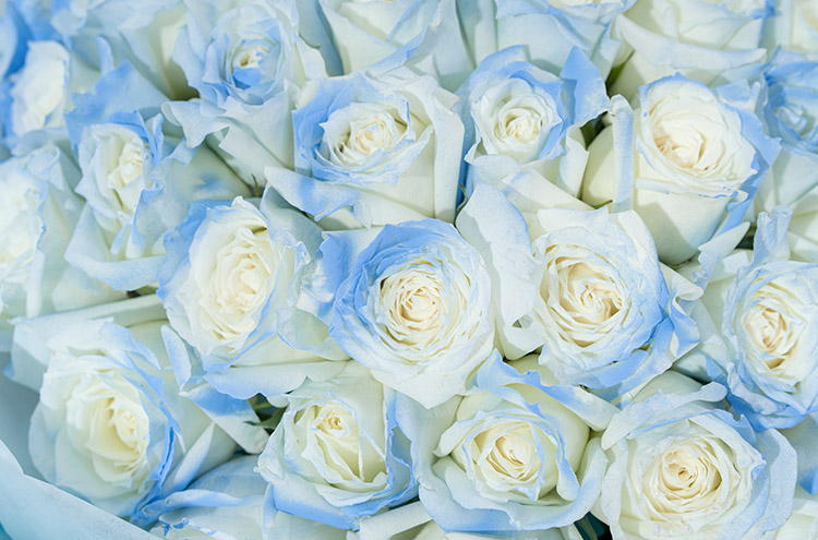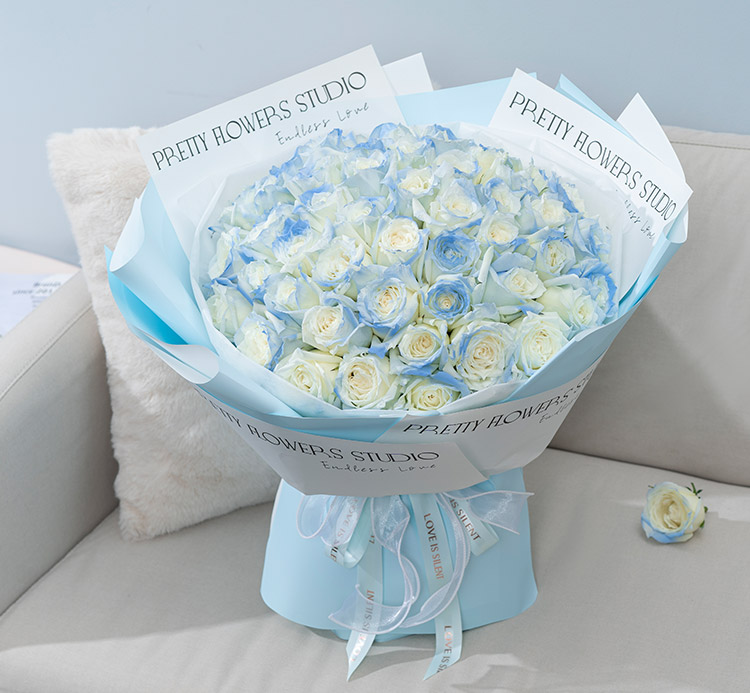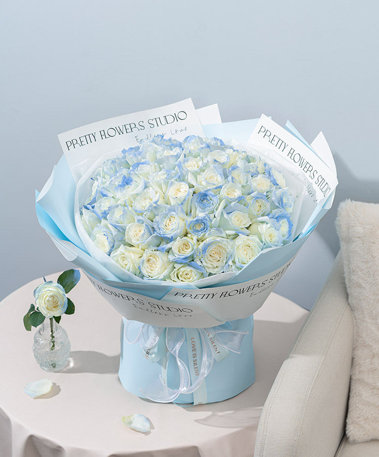 52枝碎冰蓝玫瑰(坦尼克白玫瑰,使用密西根碎冰蓝边缘喷淡蓝色工艺处理)