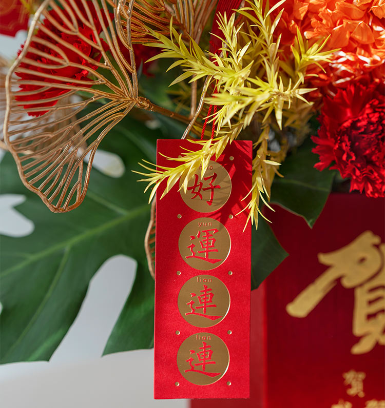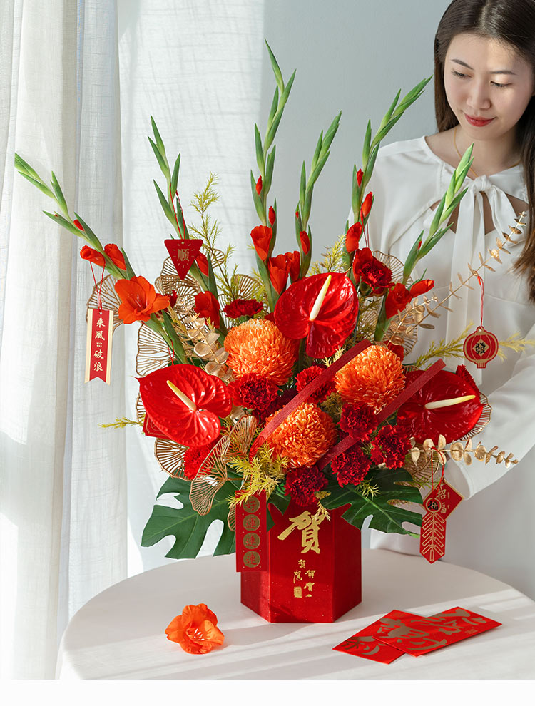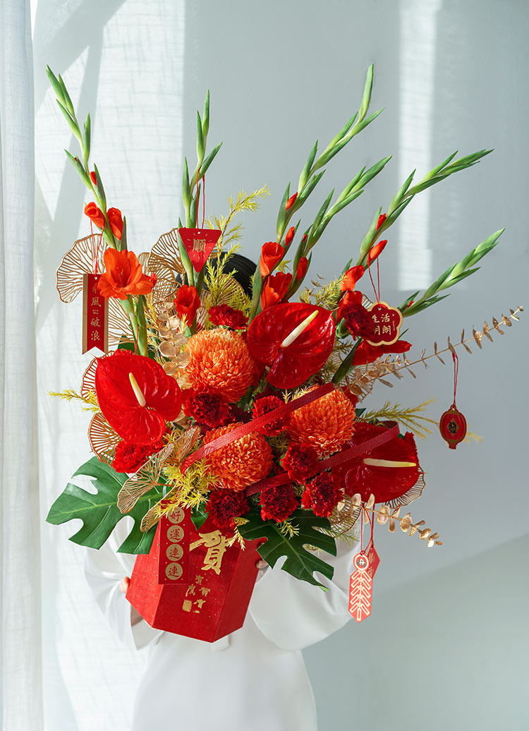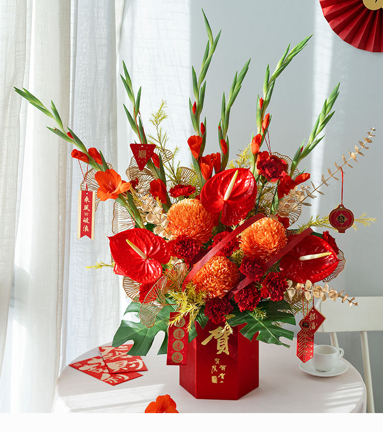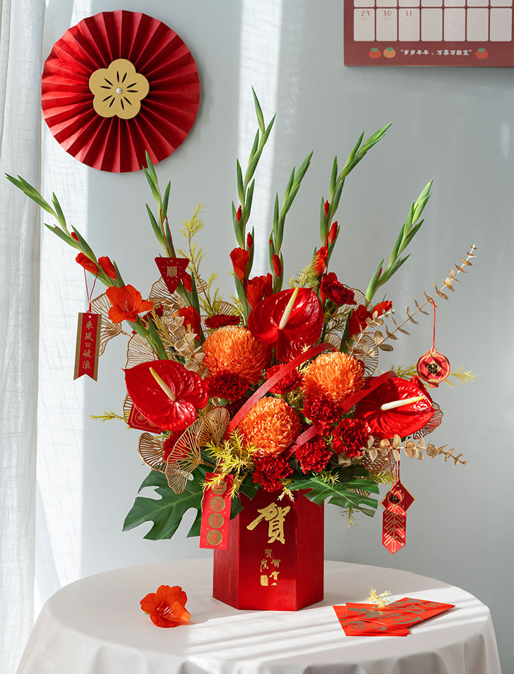 [新年抱抱桶] 红色剑兰6枝、新年福桶1个、仿真银杏叶5头,新年装饰6个
