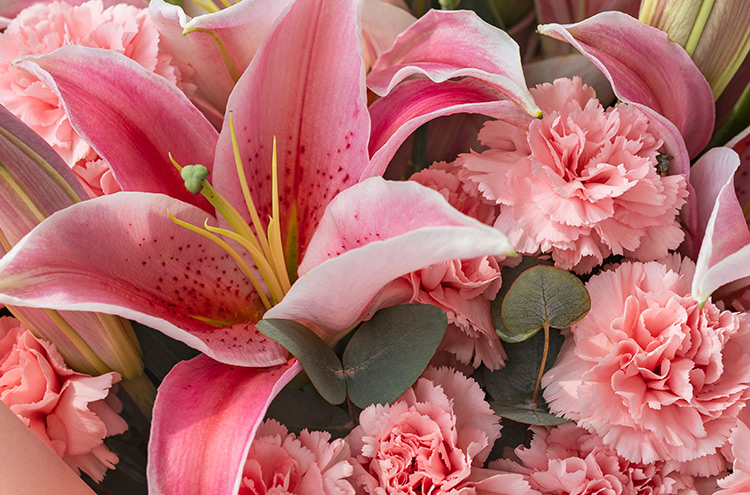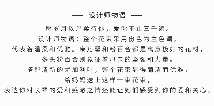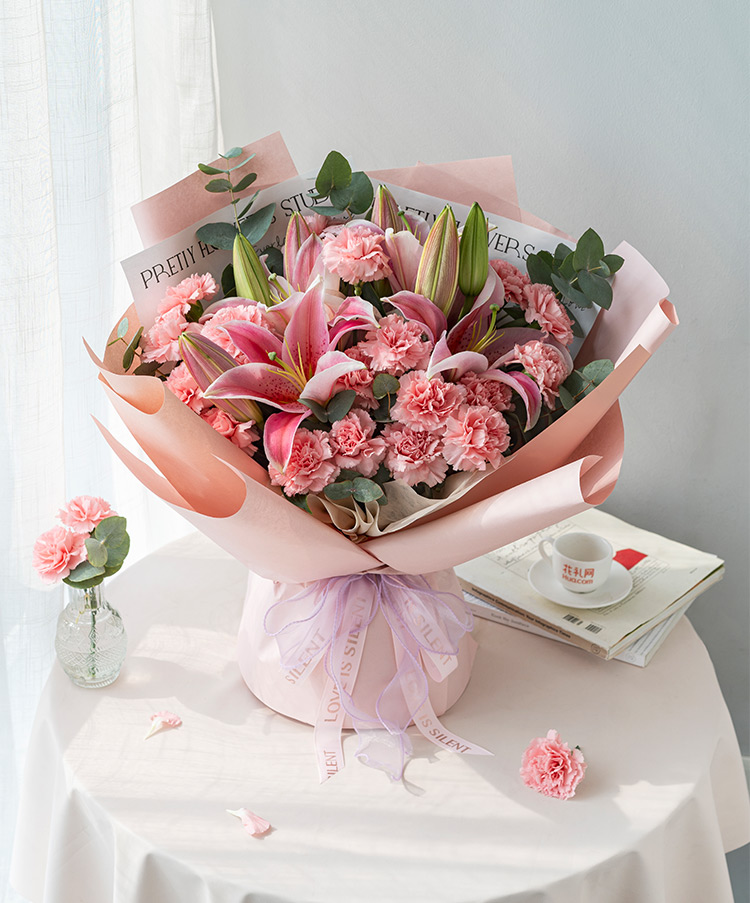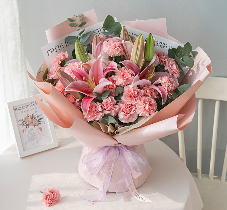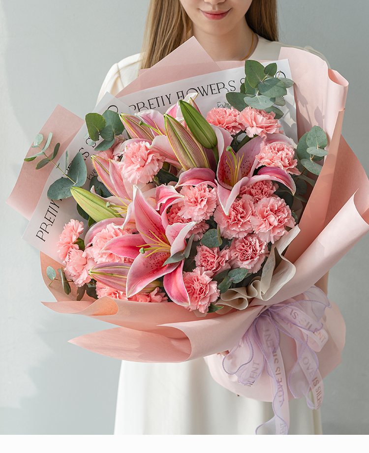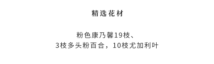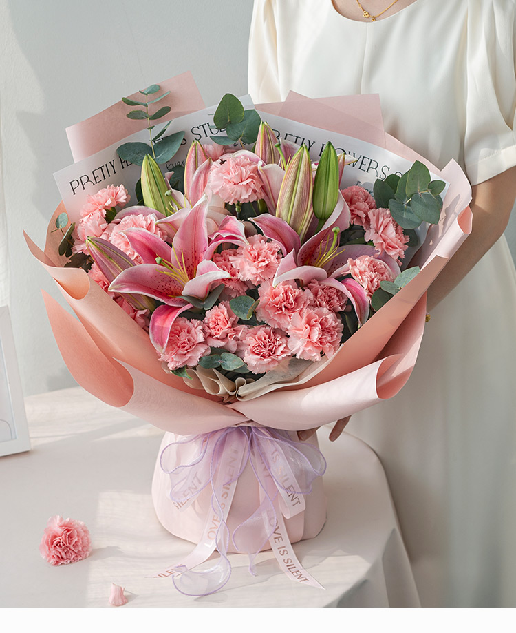 [温柔简洁,优雅关心] 粉色康乃馨19枝、3枝多头粉百合,10枝尤加利叶
