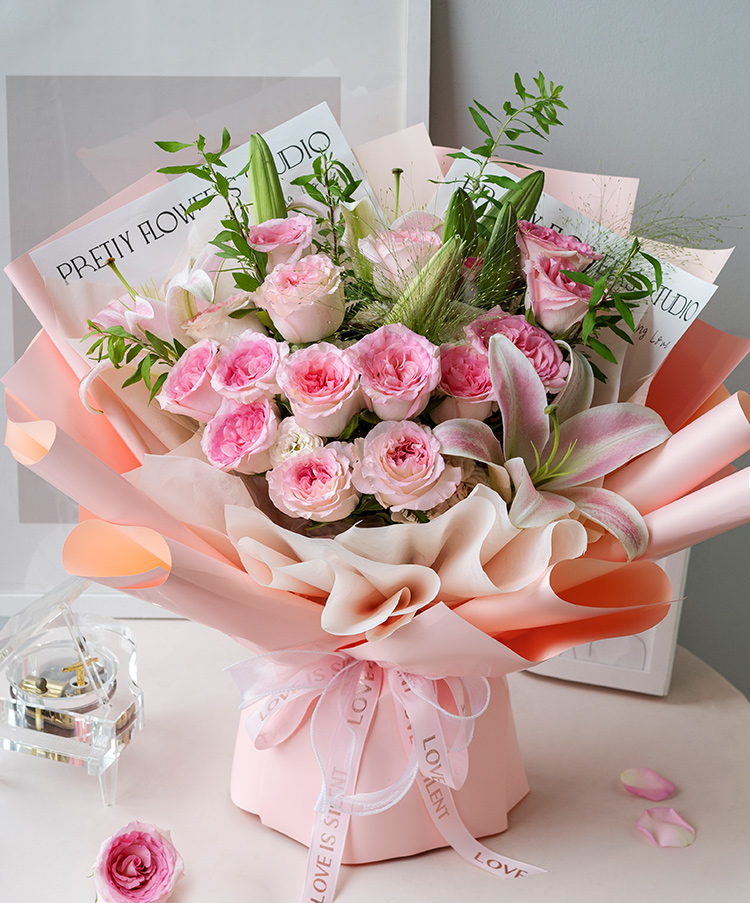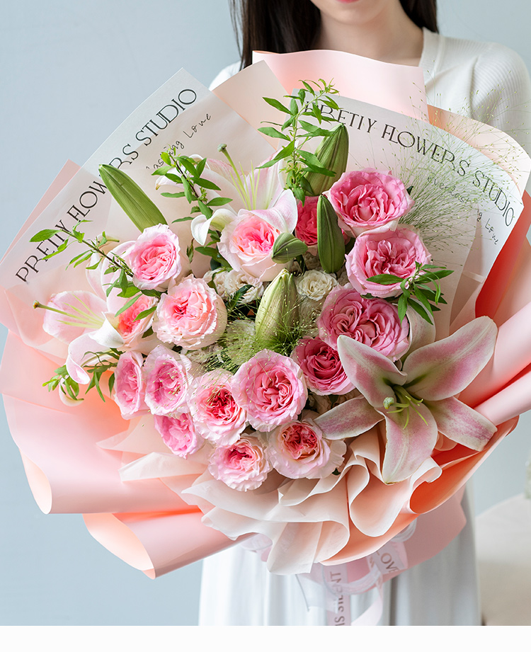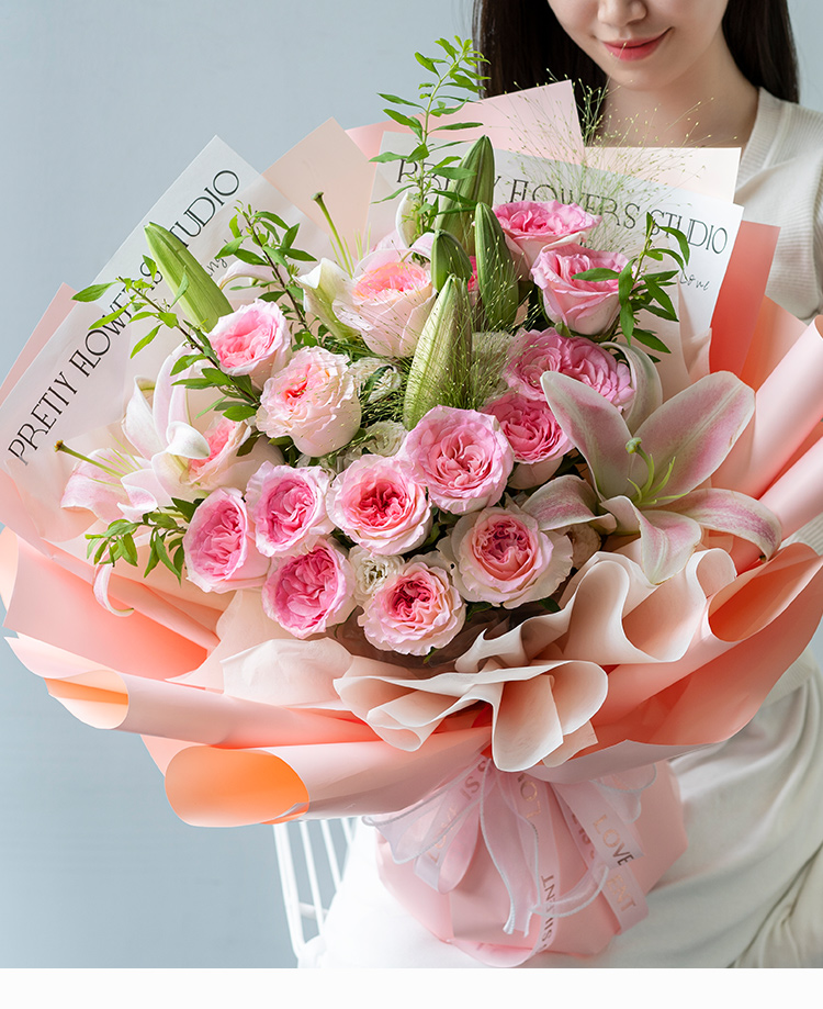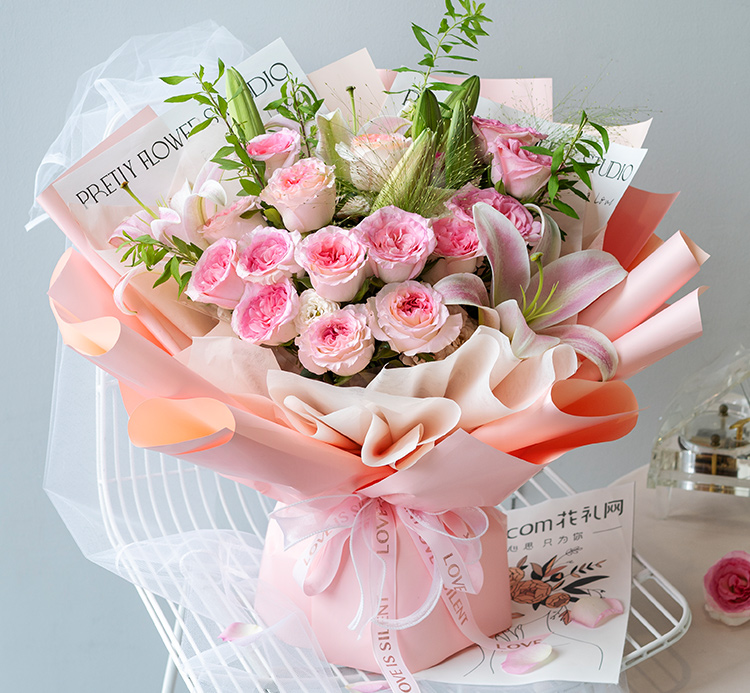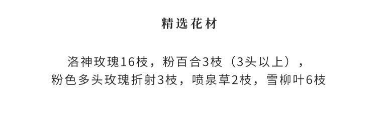 洛神玫瑰16枝,粉百合3枝(3头以上),粉色多头玫瑰折射3枝,喷泉草2枝,雪柳叶6枝