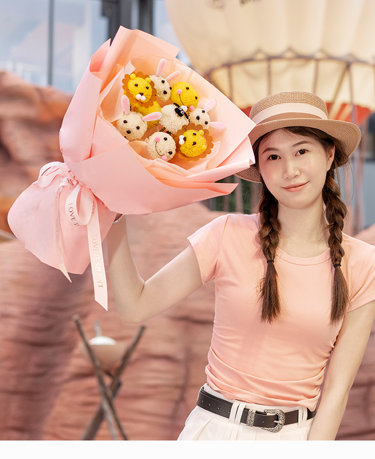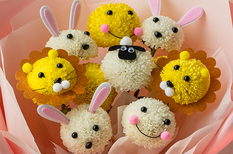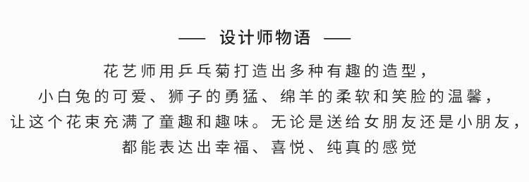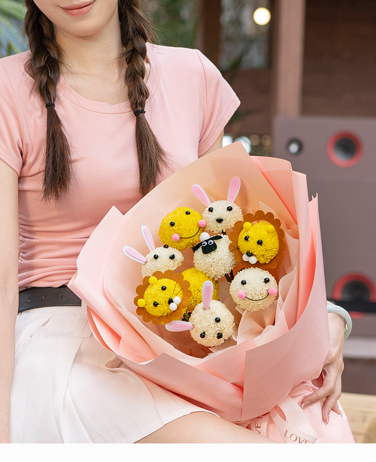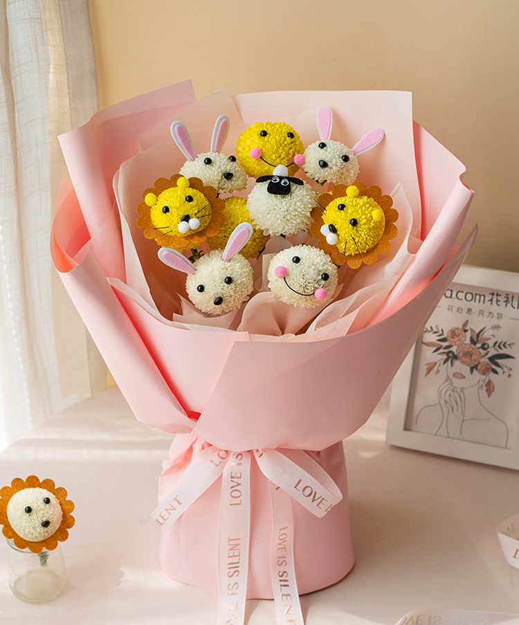 黄色乒乓菊5枝,白色乒乓菊5枝,设计出可爱造型:粉色笑脸,小狮子,小兔子,小羊