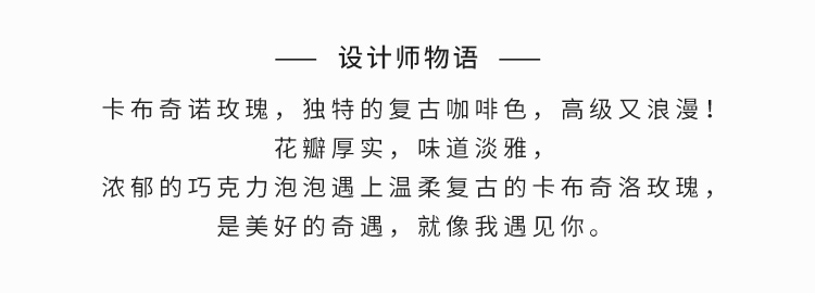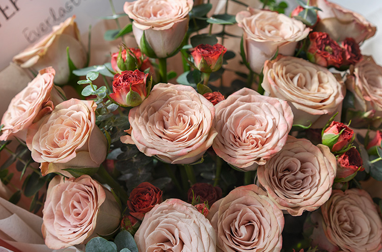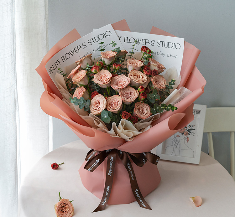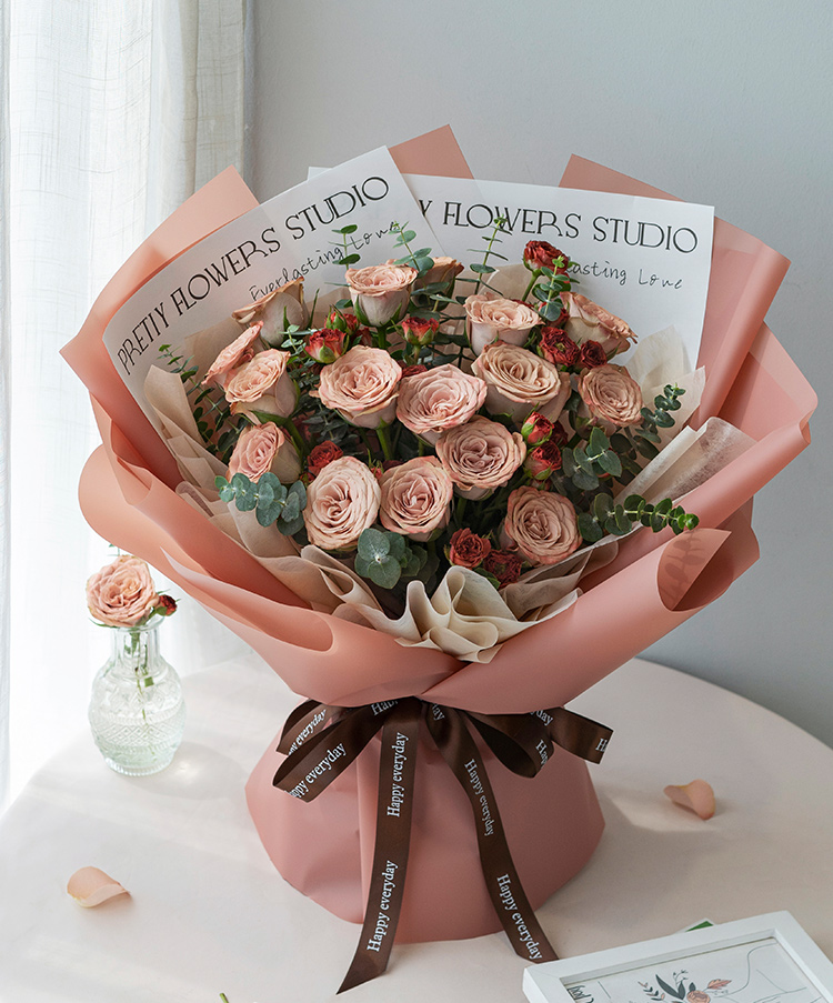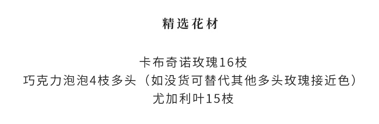 卡布奇诺玫瑰16枝(卡布奇诺有轻微焦边属玫瑰本身特性,请确认可接受再订购);6头以上巧克力泡泡4枝多头玫瑰(如没货可替代其他多头玫瑰接近色);尤加利叶15枝
