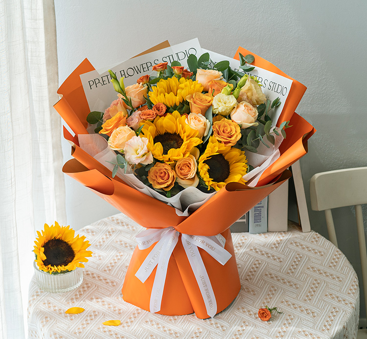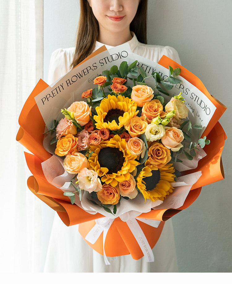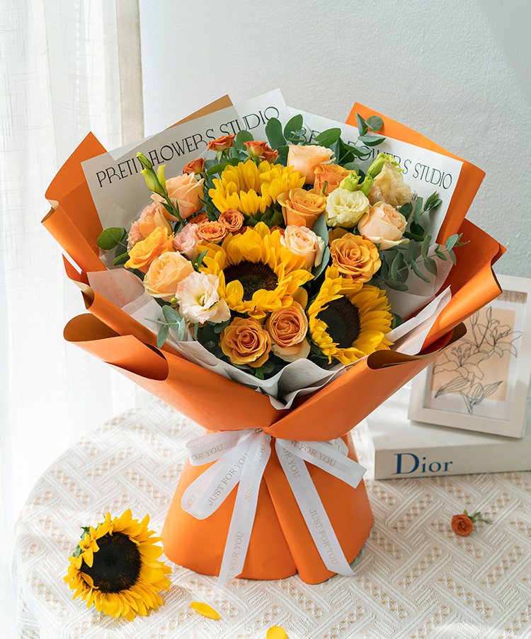 [暖暖的一束鲜花] 向日葵3枝、香槟玫瑰6枝、辉煌玫瑰5枝