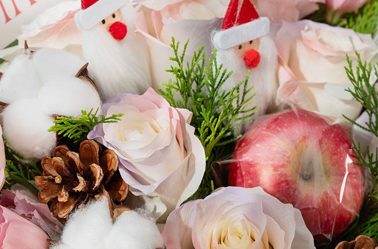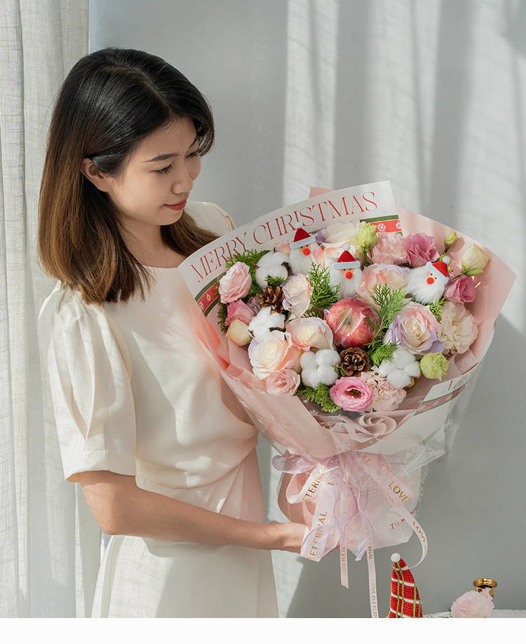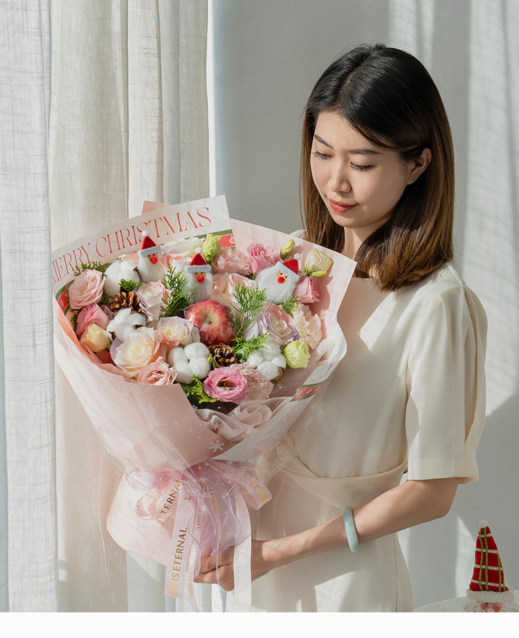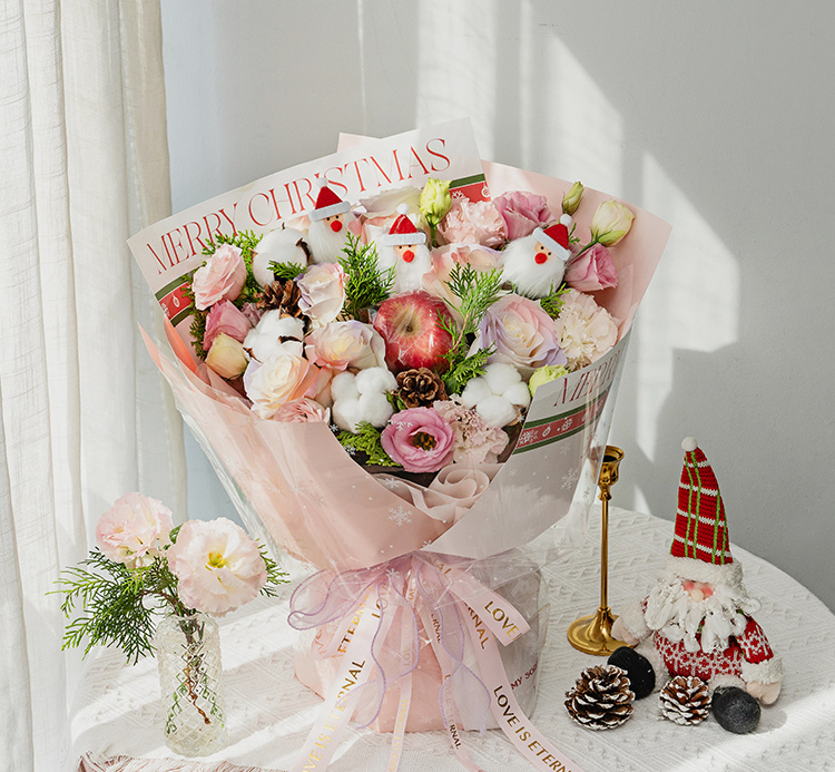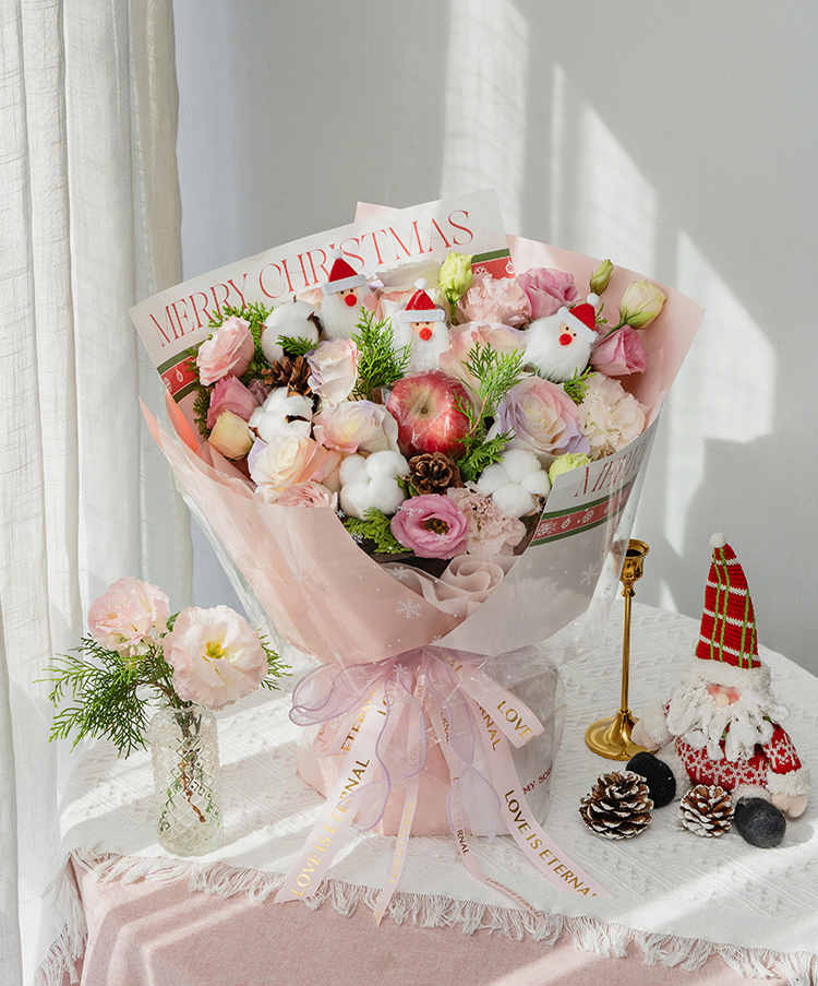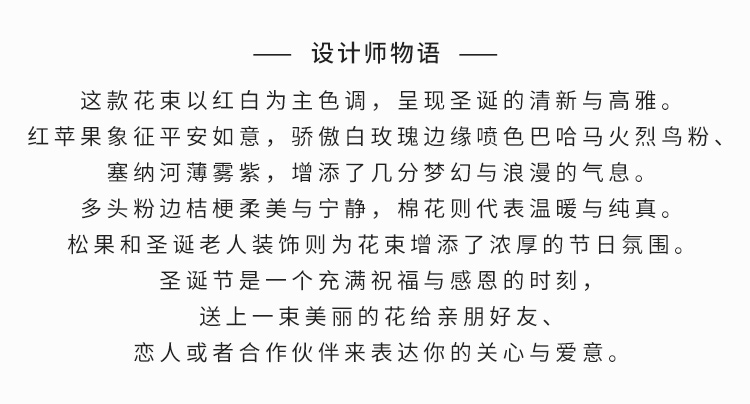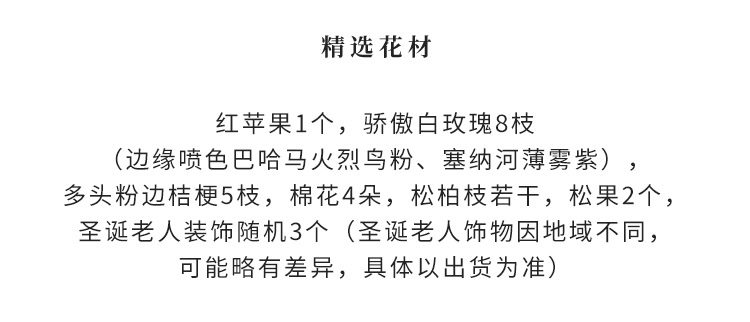 红苹果1个,骄傲白玫瑰8枝(边缘喷色巴哈马火烈鸟粉、塞纳河薄雾紫),多头粉边桔梗5枝,棉花4朵,松柏枝若干,松果2个,圣诞老人装饰随机3个(圣诞老人饰物因地域不同,可能略有差异,具体以出货为准)