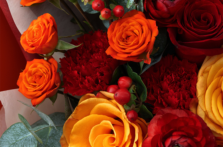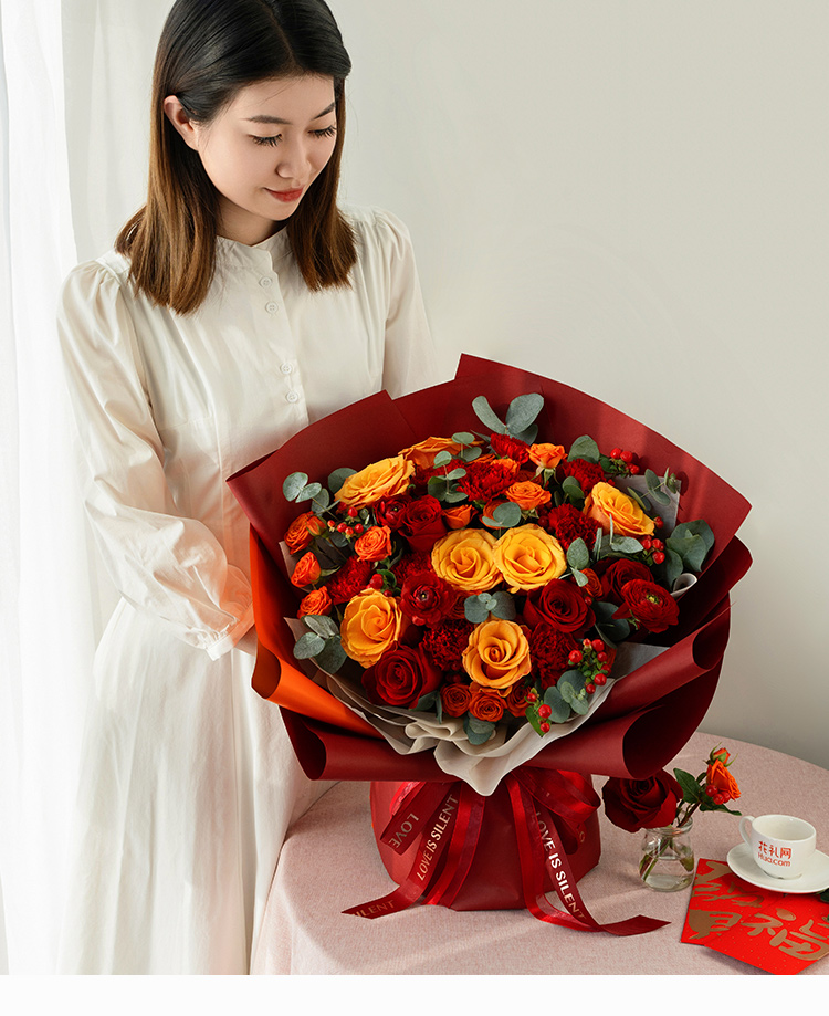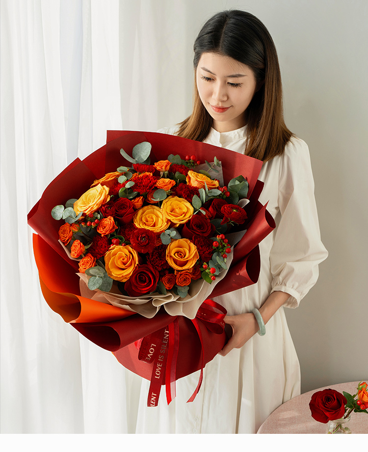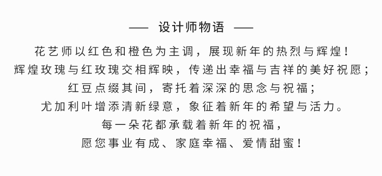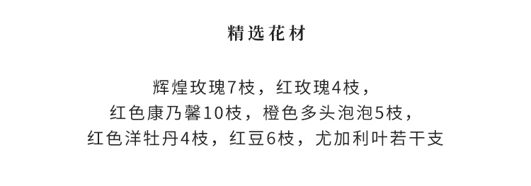 辉煌玫瑰7枝,红玫瑰4枝,红色康乃馨10枝,橙色多头泡泡5枝(6头以上/枝),红色洋牡丹4枝,红豆6枝,尤加利叶若干支