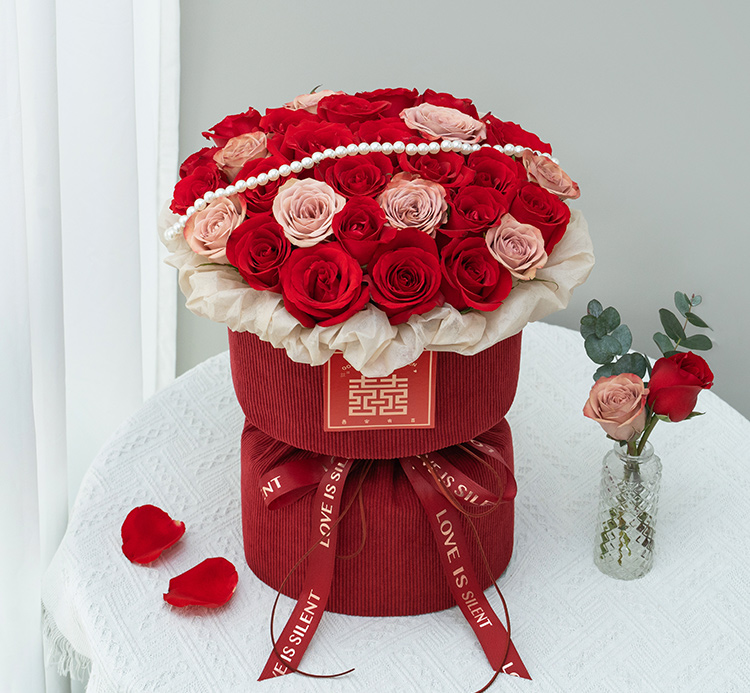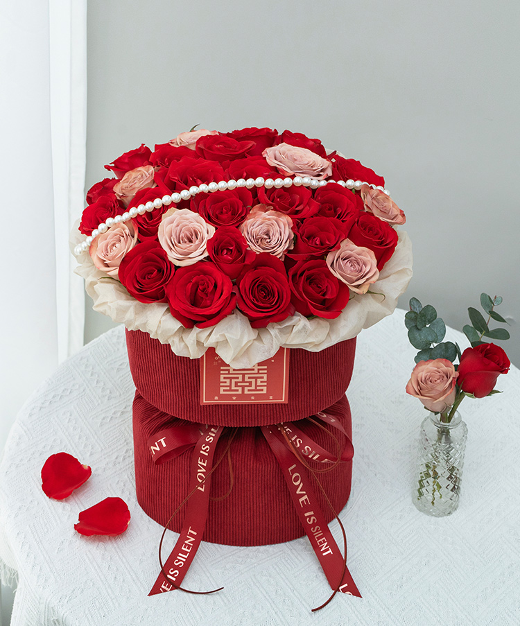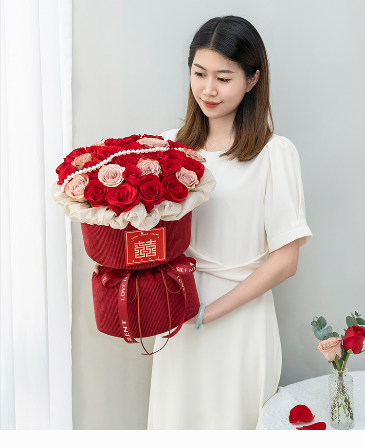 订婚、结婚专属花束,带囍字标牌:卡罗拉红玫瑰21枝,卡布奇诺8枝