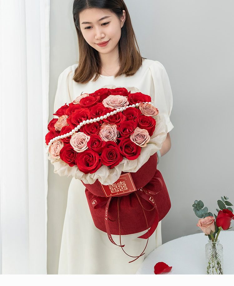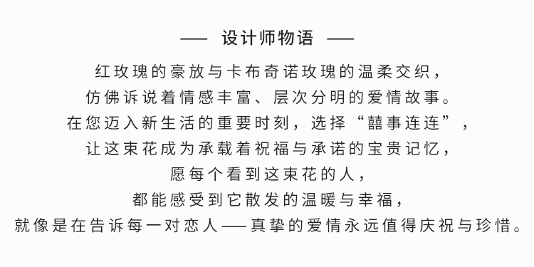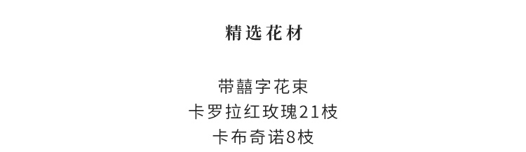 [喜庆连连,订婚结婚首选] 卡罗拉红玫瑰21枝 卡布奇诺8枝,带囍字挂牌一个(囍字挂牌样式因城市不同,可能略有差异)