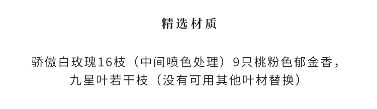 骄傲白玫瑰16枝(中间喷色处理),桃粉色郁金香9枝,九星叶若干枝(没有可用其他相似叶材替换)