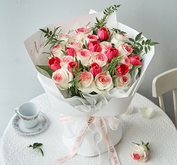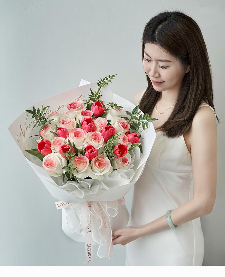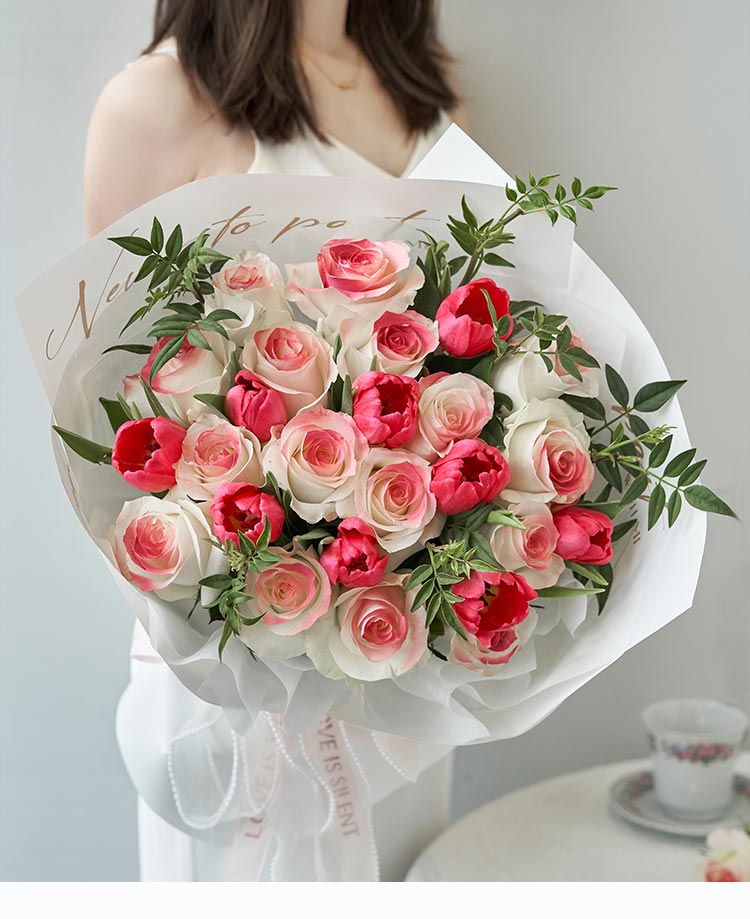 [甜美清新,温柔浪漫] 骄傲白玫瑰16枝(中间喷色处理),桃粉色郁金香9枝