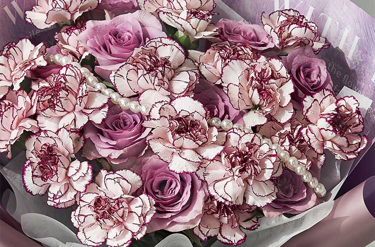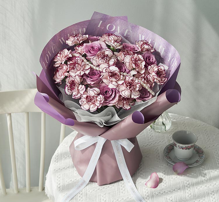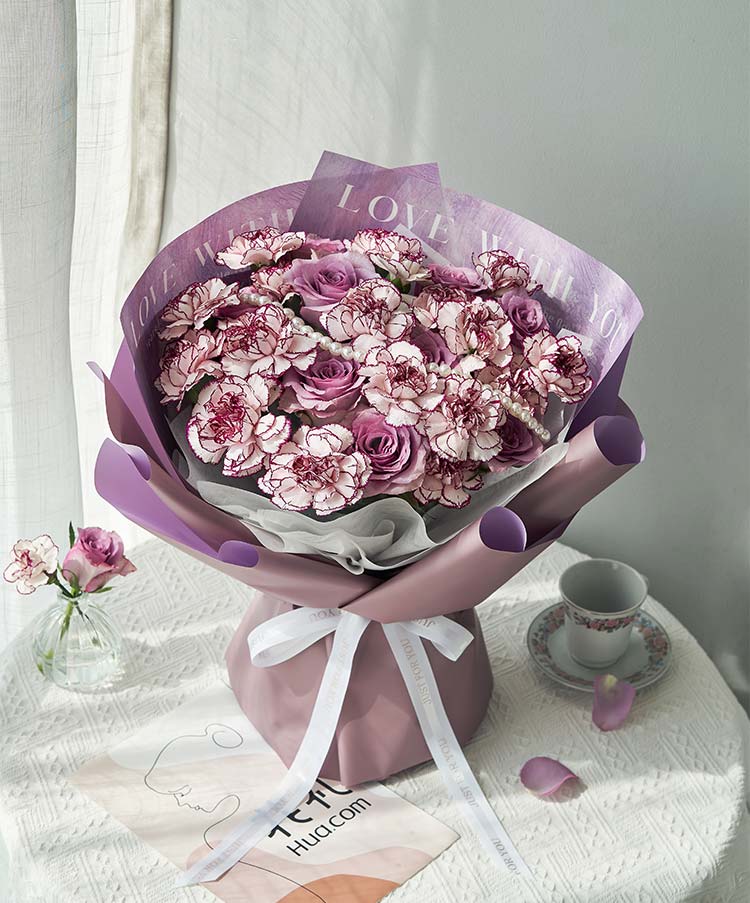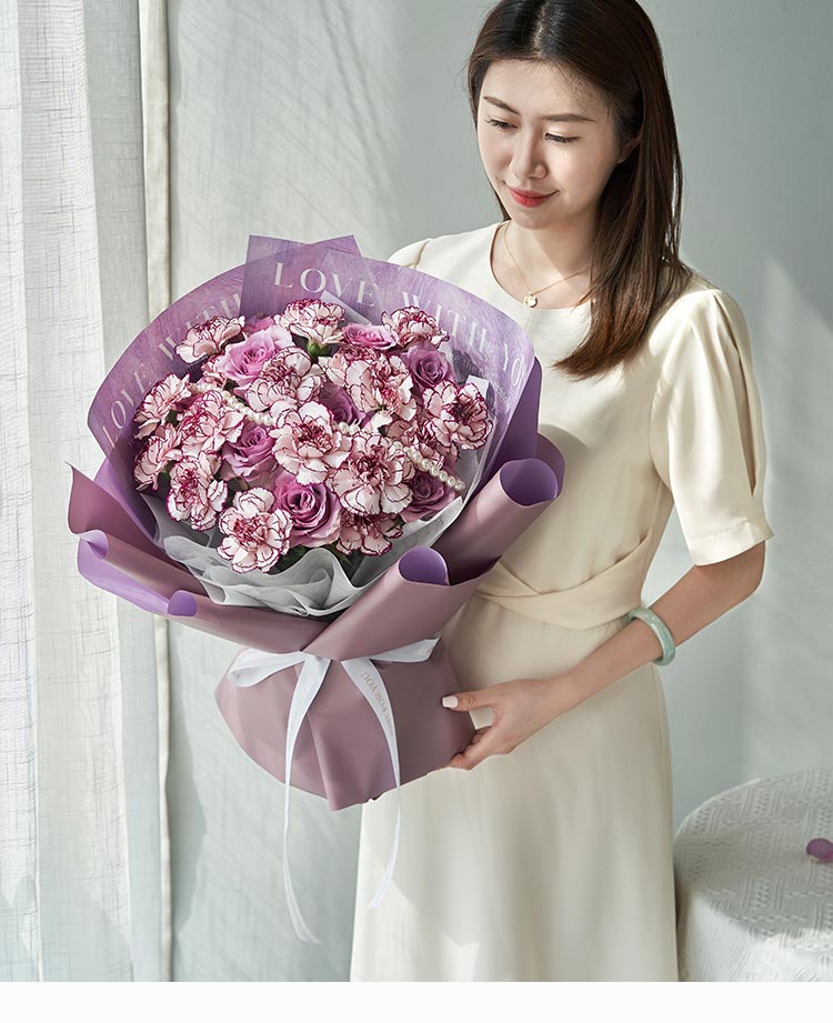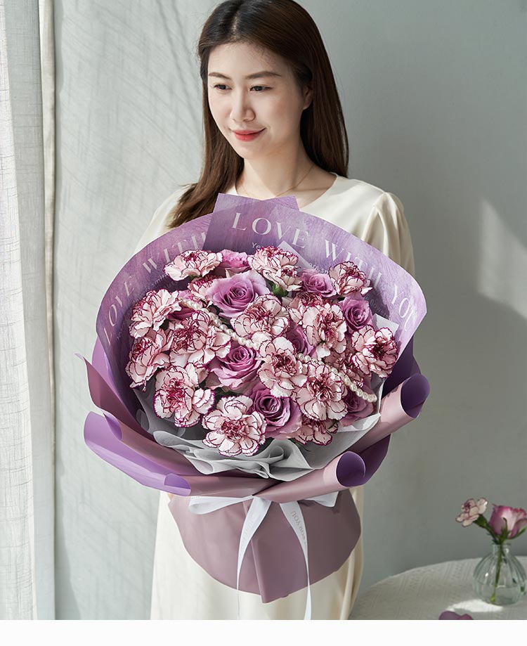 [优雅紫色调康乃馨玫瑰组合] 紫边白紫精灵康乃馨18枝,紫色玫瑰9枝