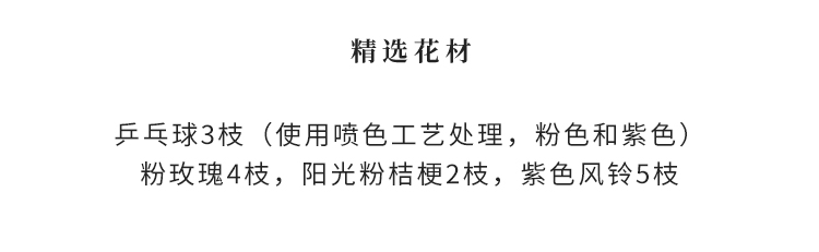 乒乓球3枝(使用喷色工艺处理,粉色和紫色)粉玫瑰4枝,阳光粉桔梗2枝,紫色风铃5枝