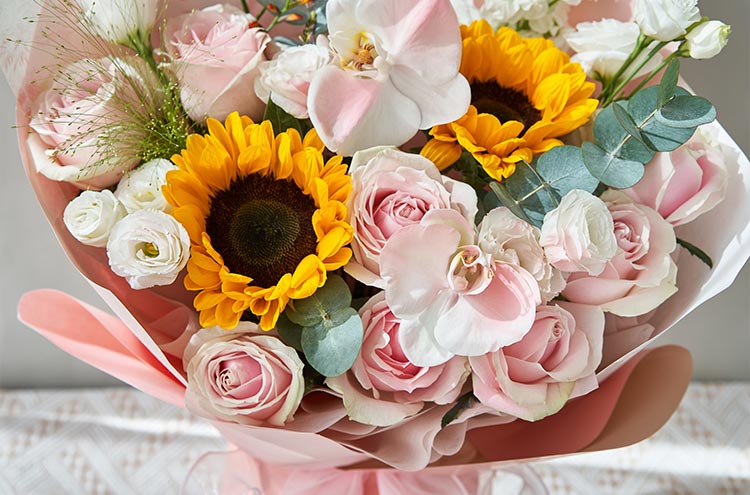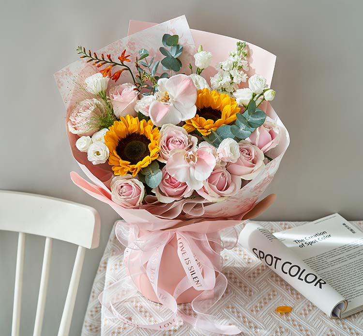 [温馨粉玫瑰搭配向日葵] 粉玫瑰或洛神玫瑰9枝、向日葵2枝、白蝴蝶兰2朵、白桔梗等