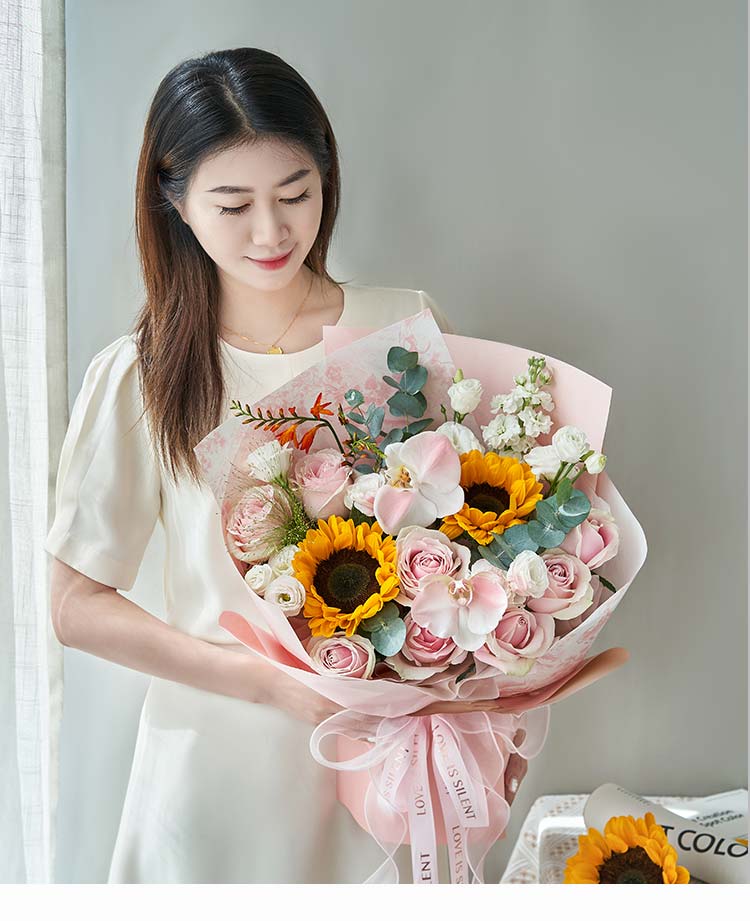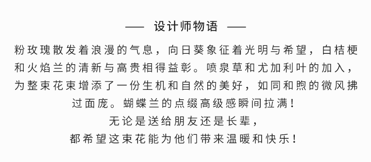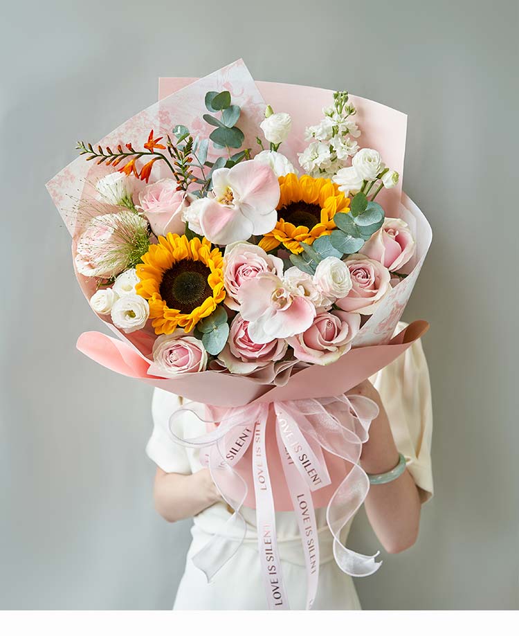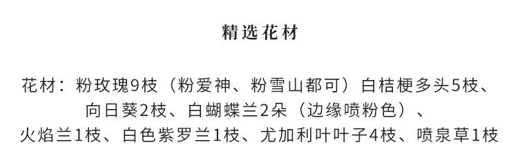 粉玫瑰9枝(粉爱神或粉雪山或洛神玫瑰)、白桔梗多头5枝(3头以上/支)、向日葵2枝、白蝴蝶兰2朵(边缘喷粉色)、火焰兰1枝、白色紫罗兰1枝、尤加利叶叶子4枝、喷泉草1枝