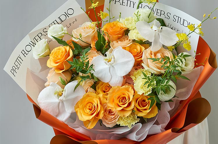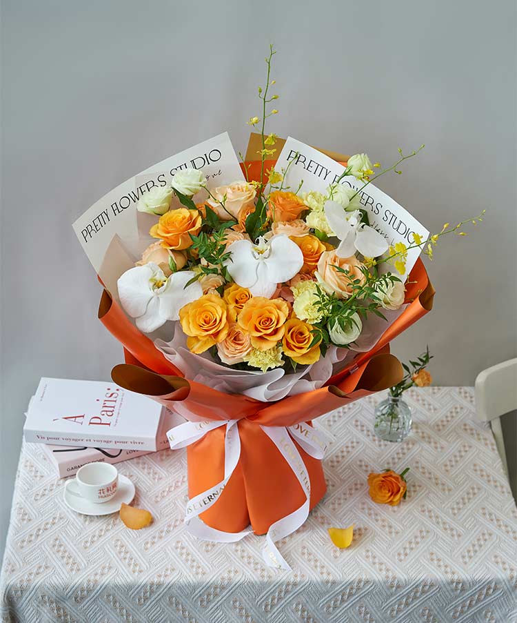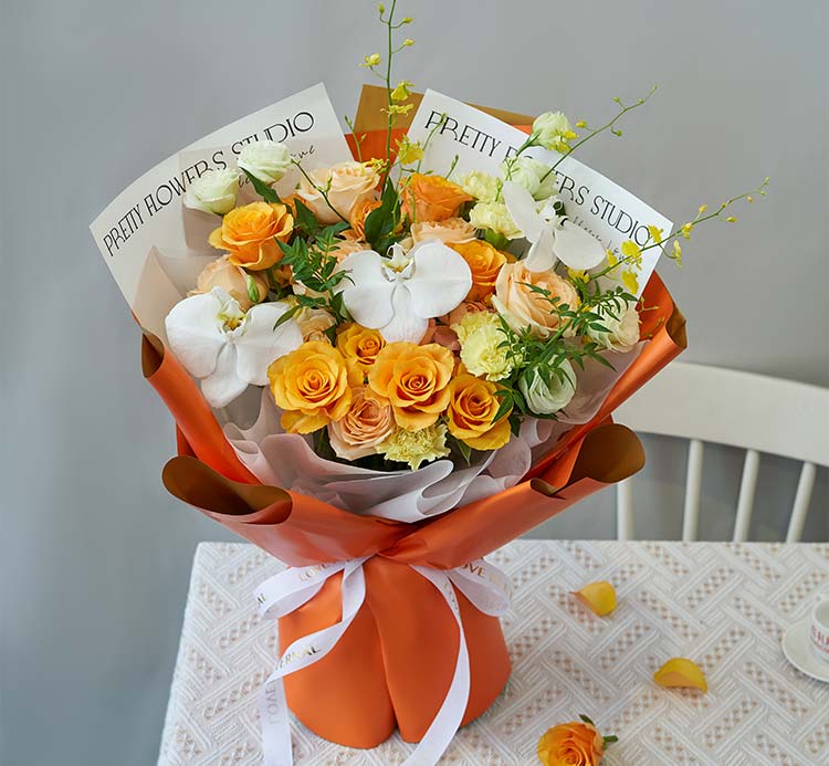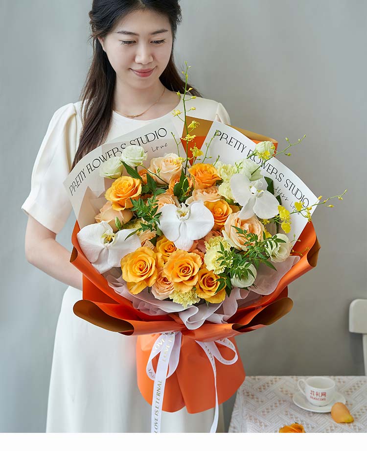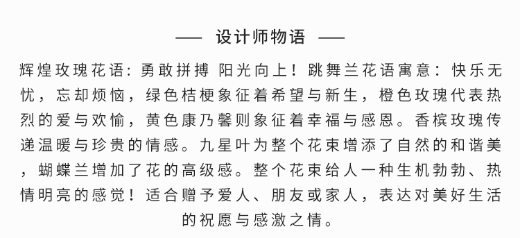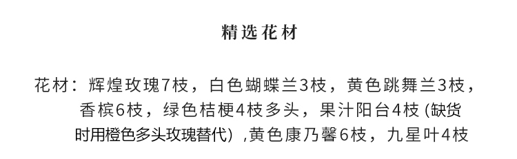 辉煌玫瑰7枝,白色蝴蝶兰3枝,黄色跳舞兰3枝,香槟玫瑰6枝,绿色桔梗4枝(3头以上/支),果汁阳台/橙色泡泡4枝(6-8头/支),黄色康乃馨6枝,九星叶4枝