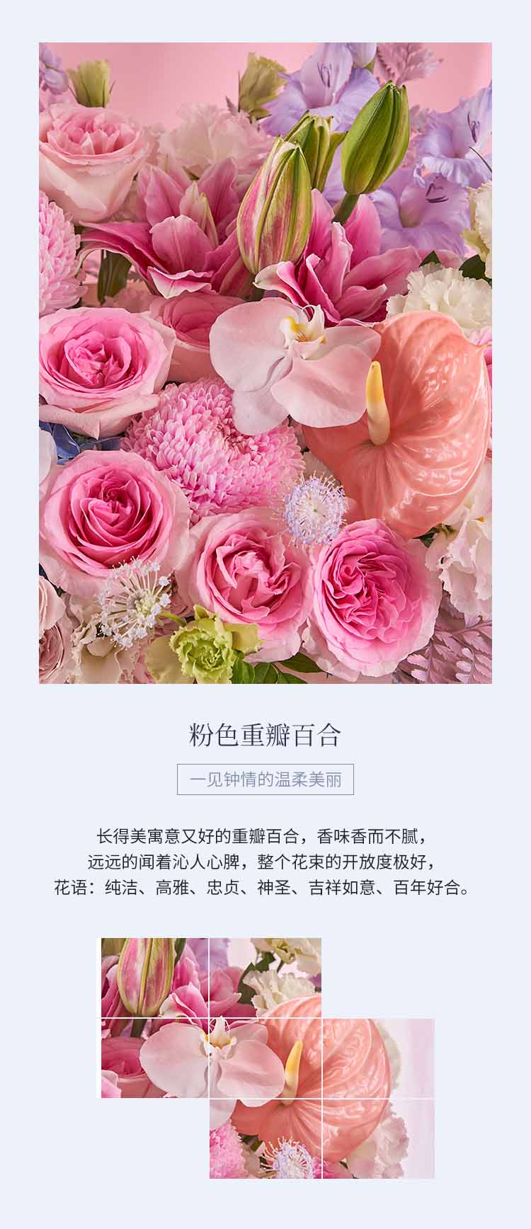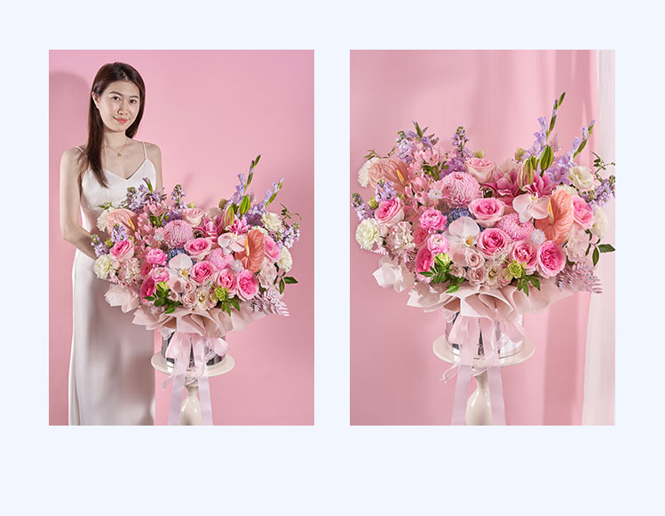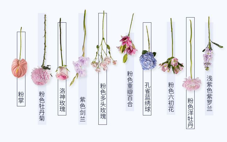 粉掌2枝,粉色牡丹菊2枝,洛神玫瑰10枝,紫色剑兰3枝,2朵蝴蝶兰喷粉色,粉色重瓣百合1枝(5头以上/枝),孔雀蓝绣球1枝,粉色六初花2枝,粉色洋牡丹2枝,浅紫色紫罗兰6枝,粉色多头玫瑰1枝(4头以上),卷边粉桔梗7枝(4头以上/枝),九星叶4枝,高山羊齿4枝喷粉色,紫色翠珠3枝
