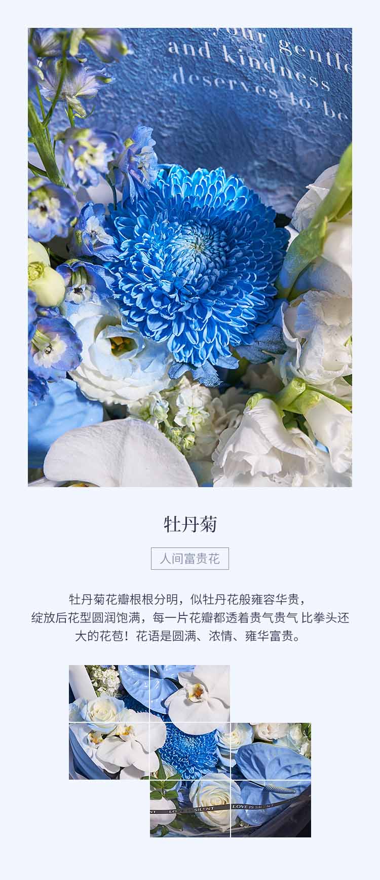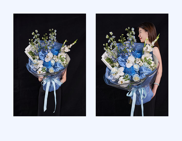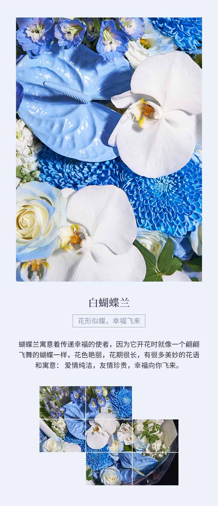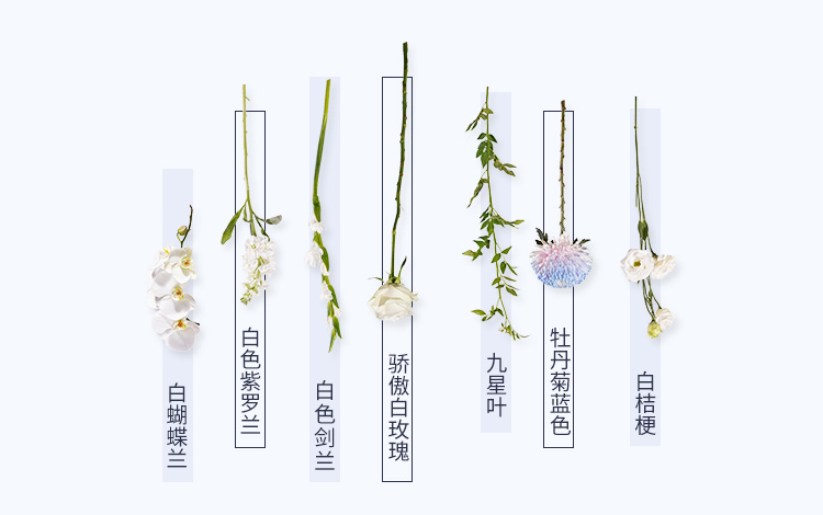 蓝色大飞燕5枝,白蝴蝶兰4朵,白色紫罗兰4枝,白色剑兰3枝,骄傲白玫瑰7朵,(边缘喷碎冰蓝),九星叶3枝,牡丹菊蓝色3朵喷碎冰蓝,白桔梗3枝,掌喷蓝色2枝,蓝色绣球1枝