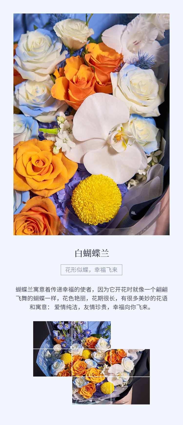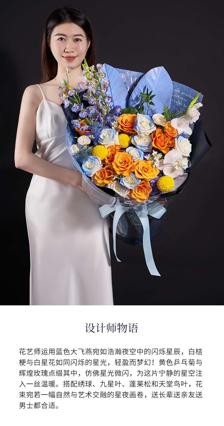 蓝色大飞燕2枝,白蝴蝶兰1朵,白色紫罗兰2枝,白色剑兰2枝,辉煌9枝,骄傲白玫瑰9朵(边缘喷碎冰蓝),九星叶3枝,白桔梗1枝,蓬莱松4朵分支(喷碎冰蓝),白星花3枝,紫色重瓣绣球1枝,黄色乒乓菊3枝,天堂鸟叶2枝喷碎冰蓝
