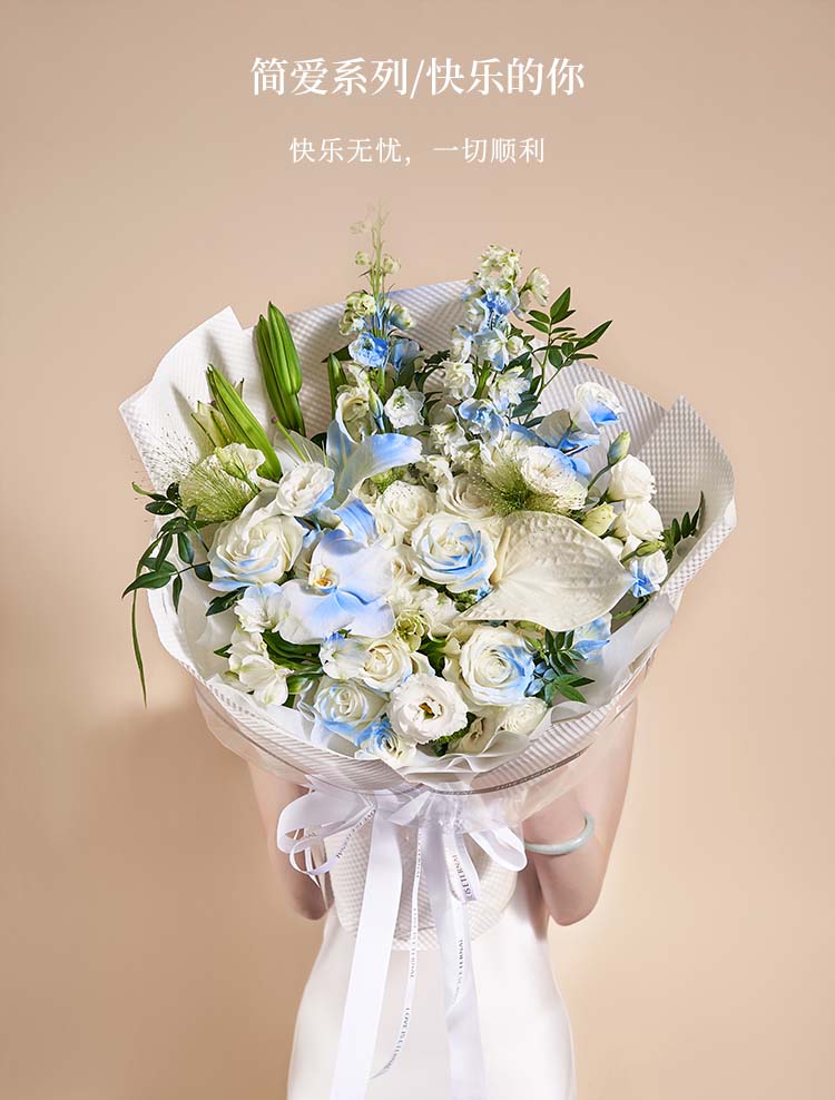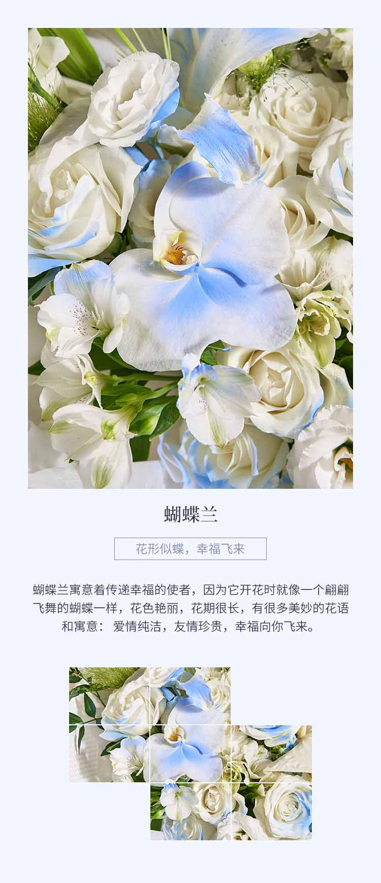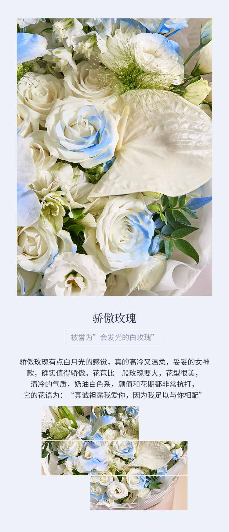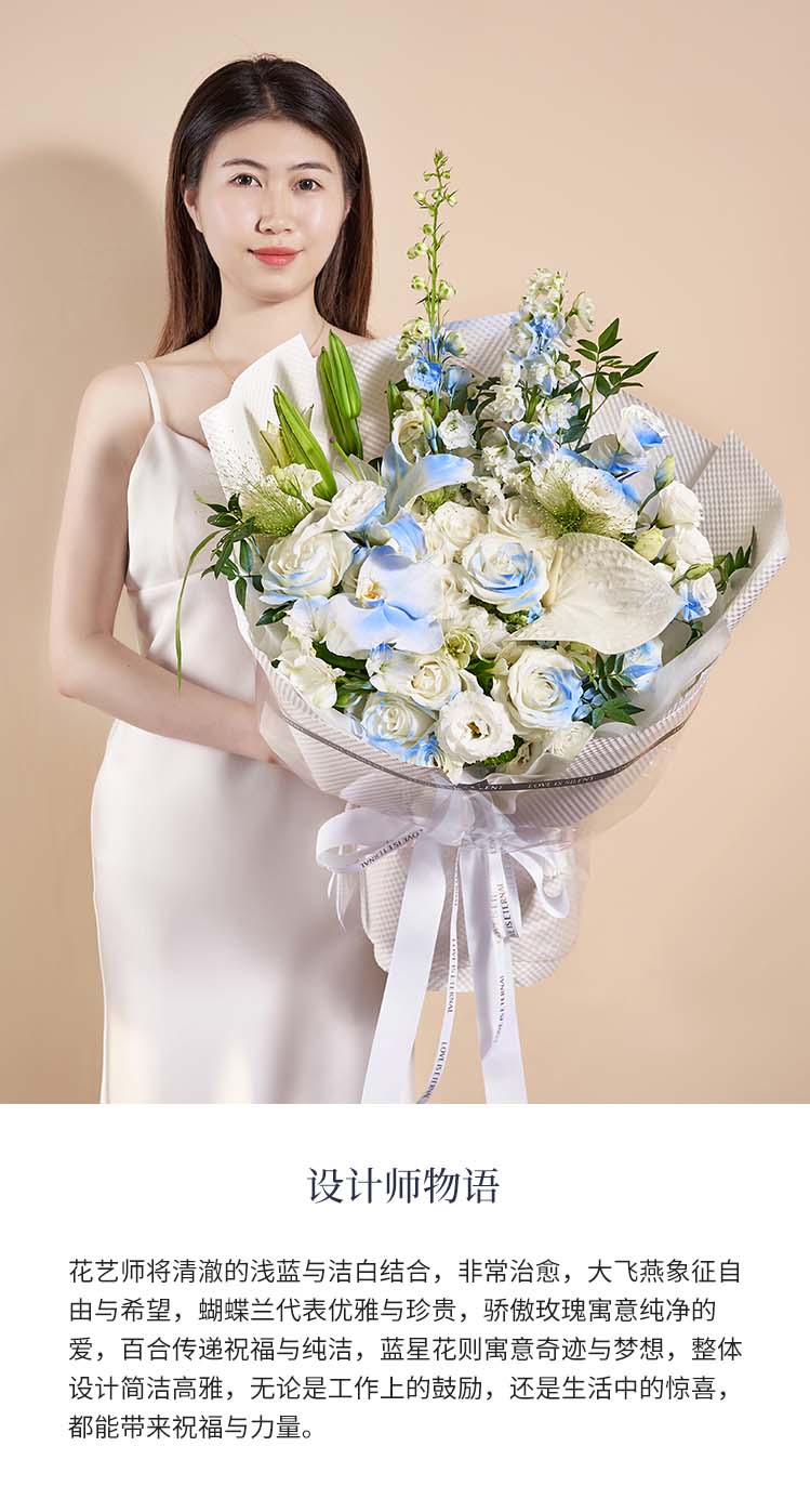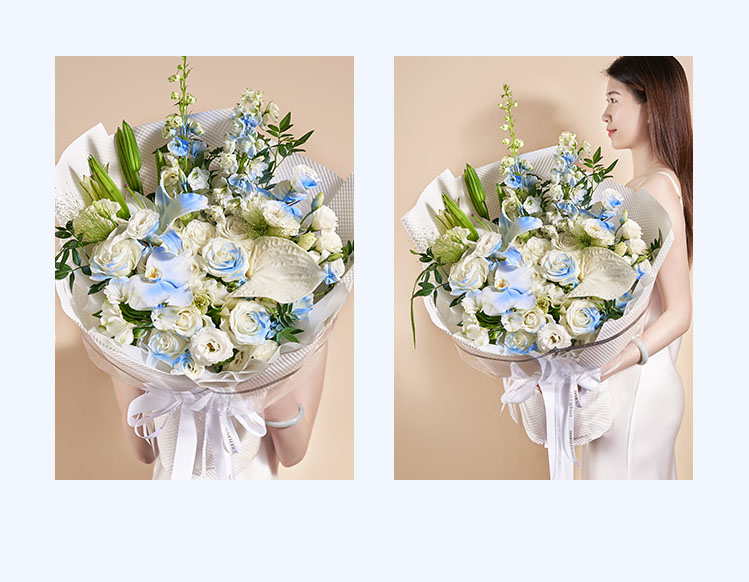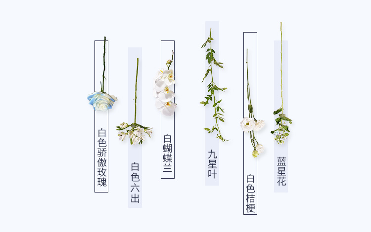 白色大飞燕2枝(喷少许浅蓝),白蝴蝶兰1朵(喷少许浅蓝),白色骄傲15枝(6枝喷浅蓝),白色六出2枝,白色百合多头1枝(边缘喷碎冰蓝),九星叶5枝,喷泉草3枝,白掌1枝,白色桔梗6枝(喷少许蓝色),蓝星花1枝