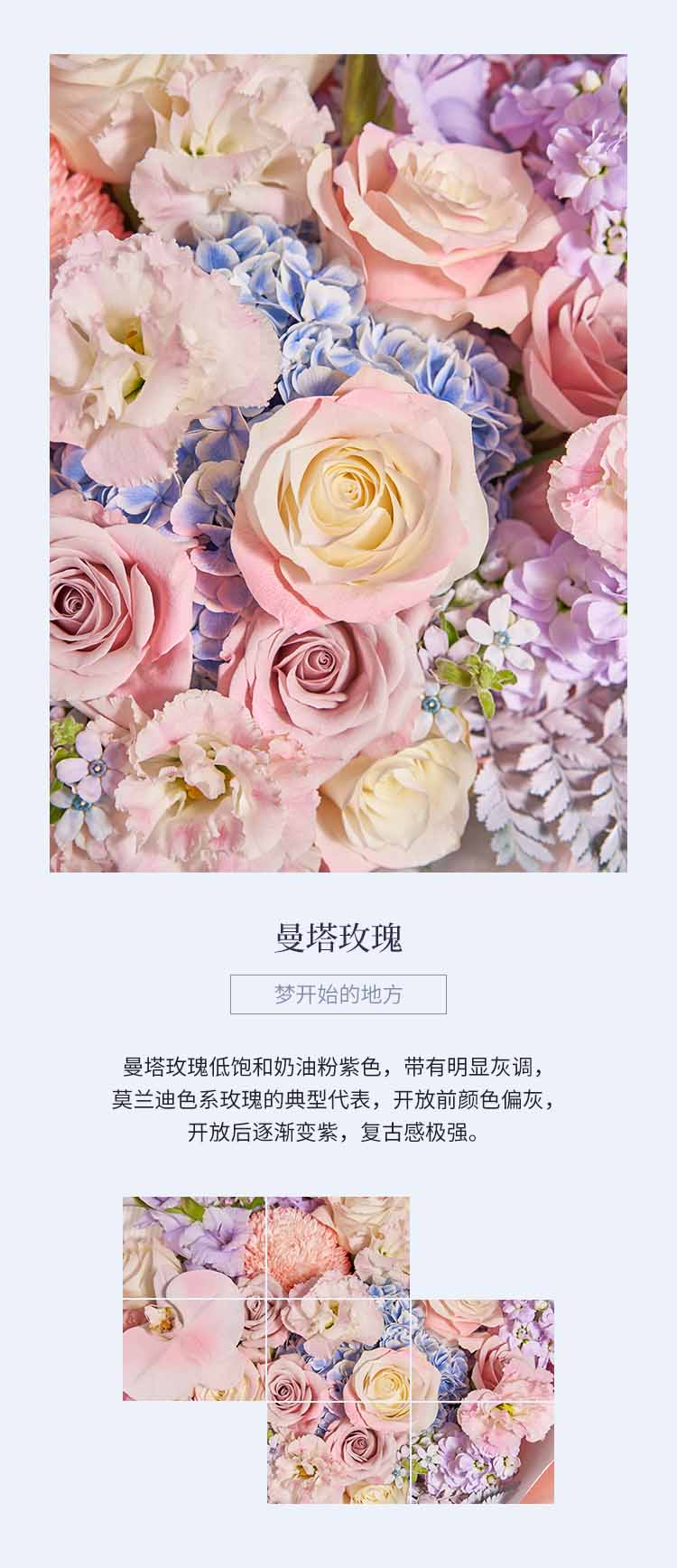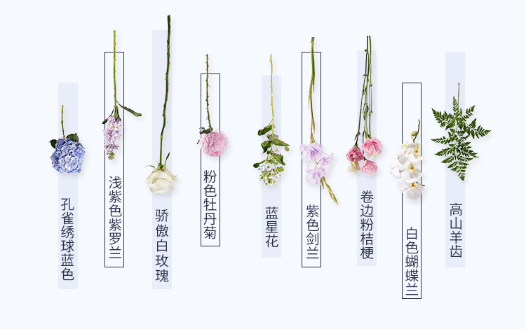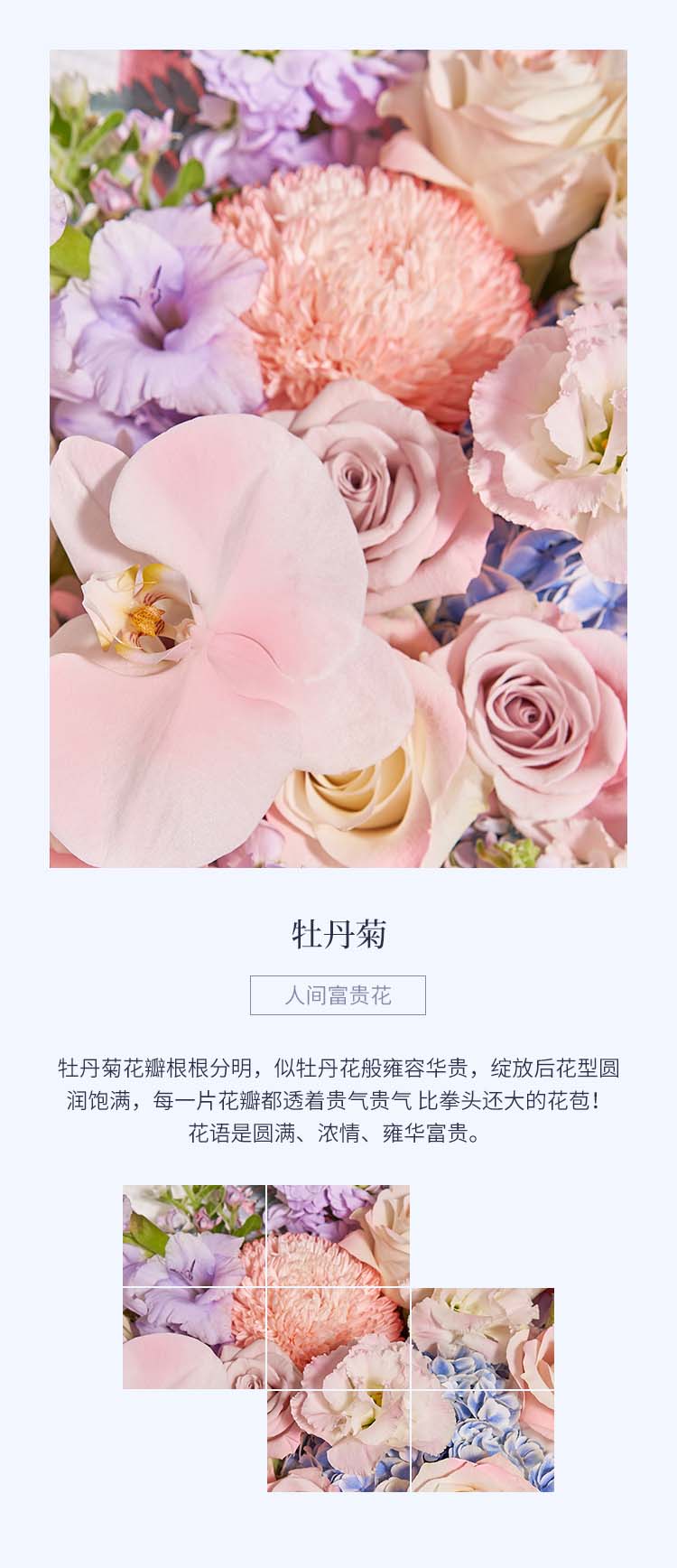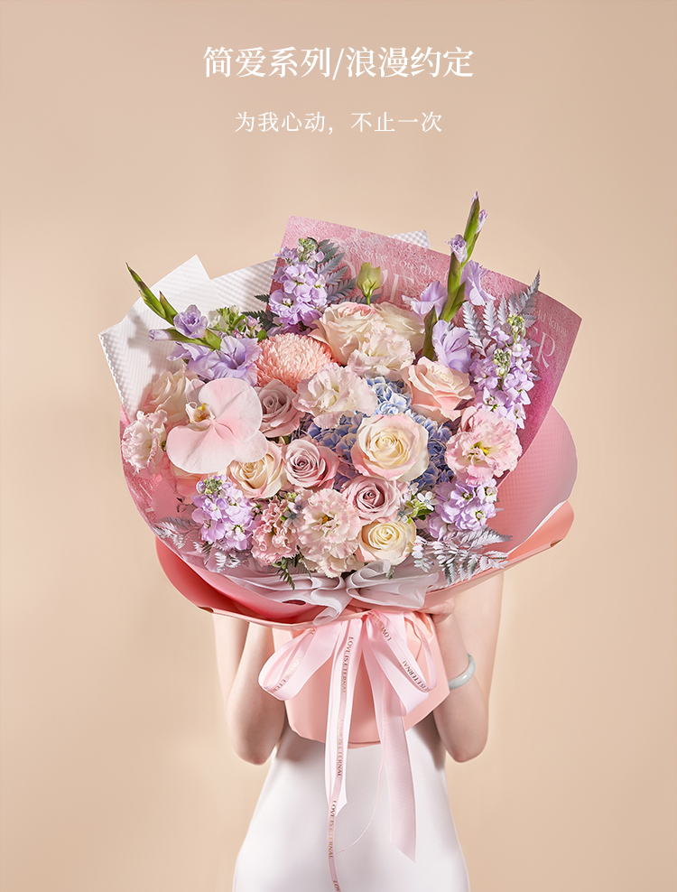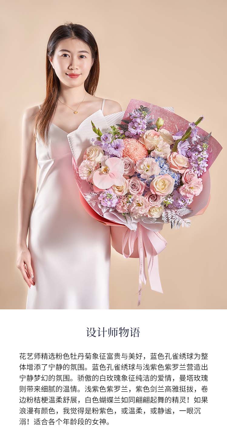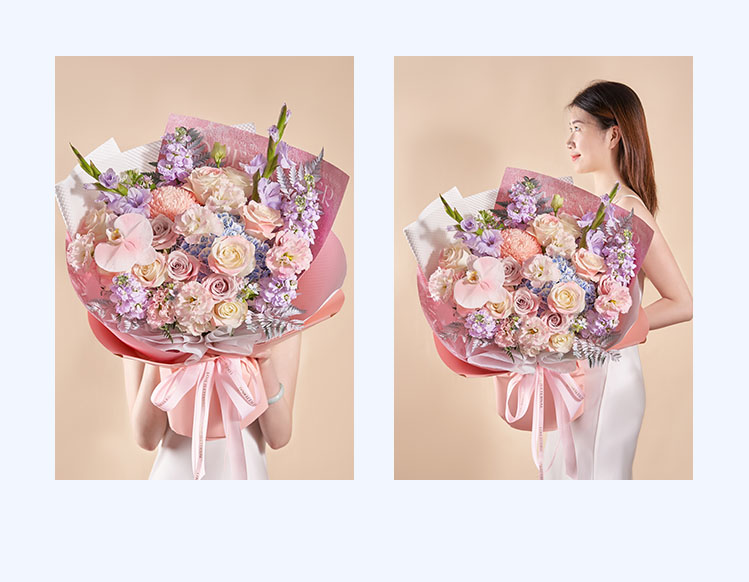粉色牡丹菊1枝,孔雀绣球蓝色1枝,浅紫色紫罗兰6枝,骄傲白玫瑰8枝(喷淡粉色),曼塔玫瑰4枝,蓝星花4枝,紫色剑兰2枝,卷边粉桔梗4枝(3头以上/枝)白色蝴蝶兰1朵(花心喷浅粉)高山羊齿4枝喷粉色