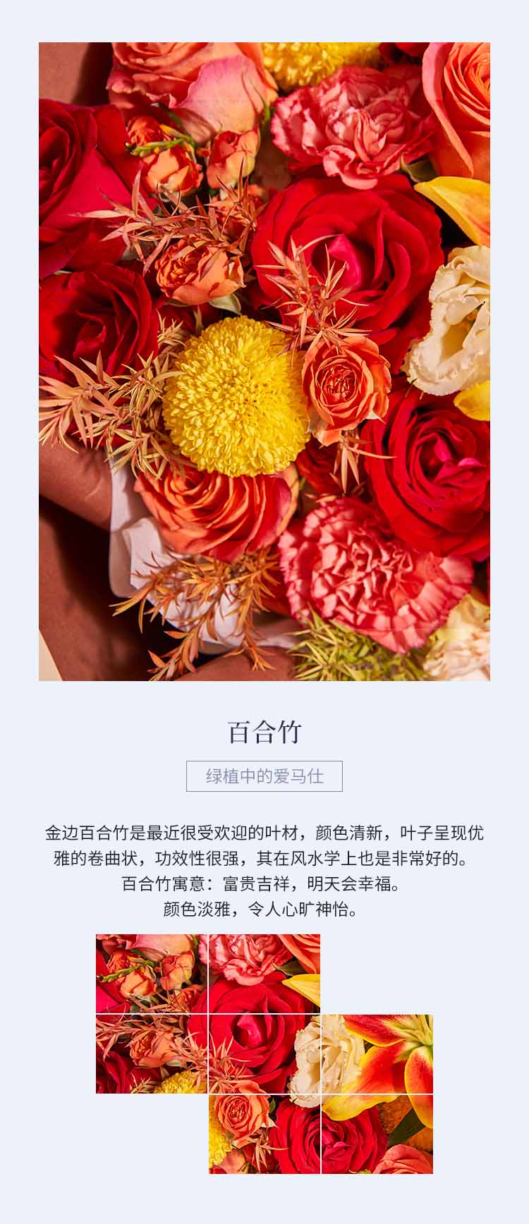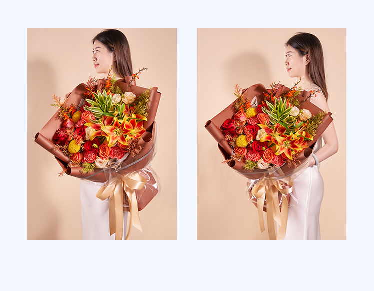 橙色皇冠亚百合1枝(3-5头/枝),百合竹一枝,红玫瑰5枝,黄色乒乓菊3枝,国王日橙色玫瑰6枝,香槟色洋桔梗3枝(3头以上/枝),火焰蓝5枝,橙色多头泡泡橙芭比2枝(5头以上1枝),橙色康乃馨5枝,千层金金色10枝