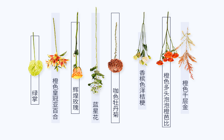橙色皇冠亚百合1枝(3-5头/枝),咖色牡丹菊2枝,绿掌1枝,辉煌玫瑰12枝,香槟色洋桔梗7枝(3头以上/枝),蓝星花6枝,橙色多头泡泡橙芭比5枝(5头以上1枝),九星叶3枝,粉色弗朗1枝,橙色千层金7枝
