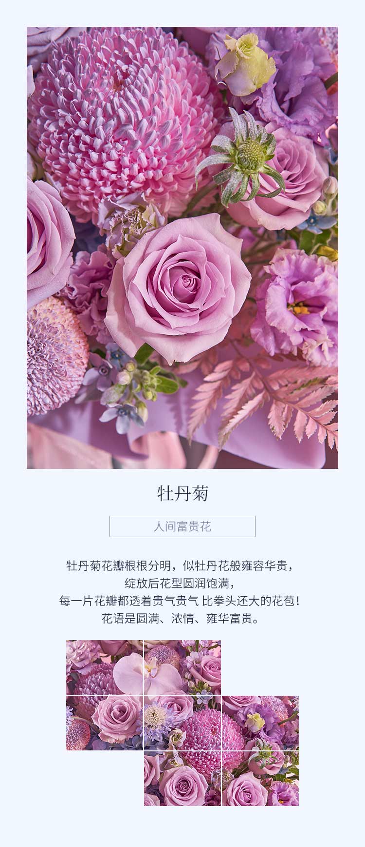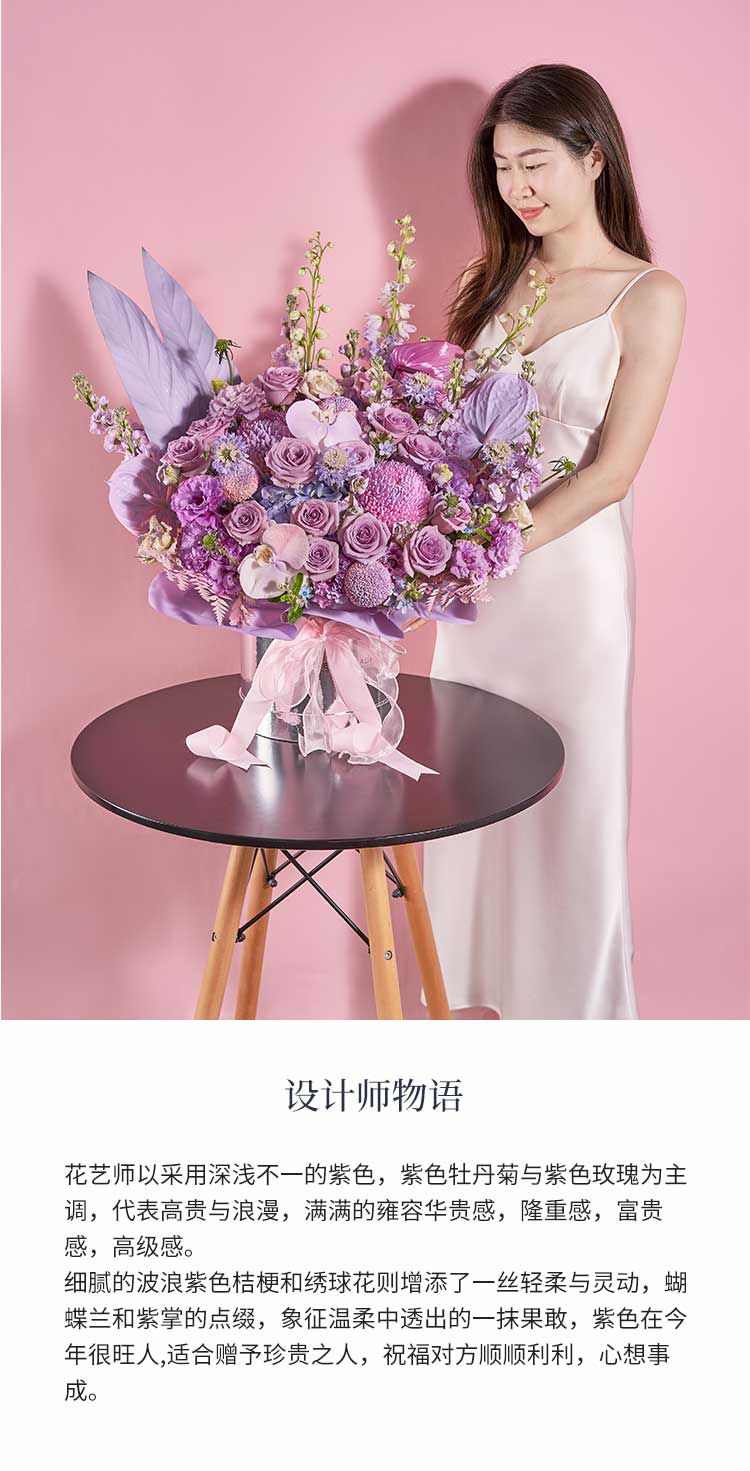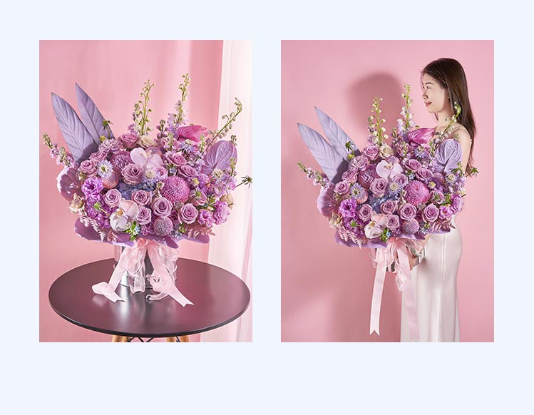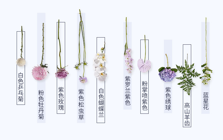 粉色牡丹菊喷紫色2枝,白色乒乓菊喷紫色4枝,波浪紫色桔梗5枝(3头/枝),紫色玫瑰海洋之歌15枝,紫色绣球1枝,紫色松虫草4枝,紫色掌1枝,粉掌喷紫色2枝,白色蝴蝶兰喷紫色2朵,大飞燕紫色3枝,高山羊齿2枝喷粉色,蓝星花4枝,紫罗兰紫色8枝,天堂鸟叶2枝喷紫色
