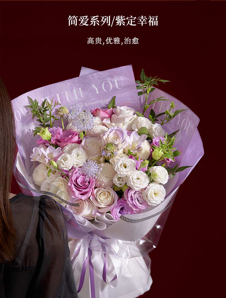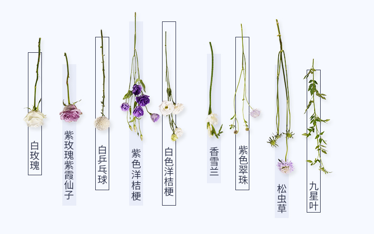 白玫瑰骄傲7枝(中间喷淡紫色),紫玫瑰紫霞仙子3枝,白乒乓球4枝,紫色洋桔梗3枝多头(3头以上/枝),白色洋桔梗4枝多头(3头以上/枝),紫色香雪兰2枝,紫色翠珠2枝,松虫草1枝,九星叶3枝