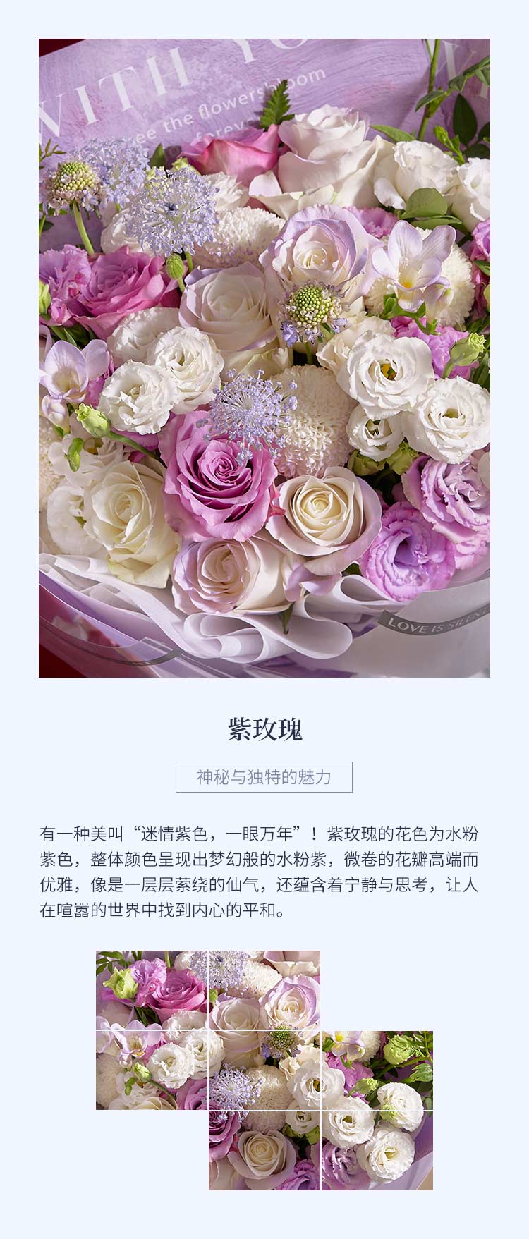 (备注:骄傲白玫瑰使用塞纳河薄雾紫喷色工艺处理)
