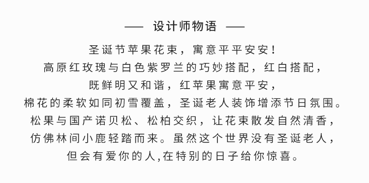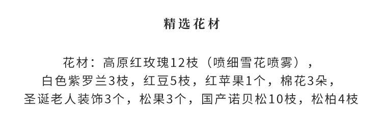 高原红玫瑰12枝(喷细雪花喷雾),白色紫罗兰3枝,红豆5枝,红苹果1个,棉花3朵,圣诞老人装饰3个(圣诞老人饰物因地域不同,可能略有差异,具体以出货为准),松果3个,国产诺贝松10枝,松柏4枝